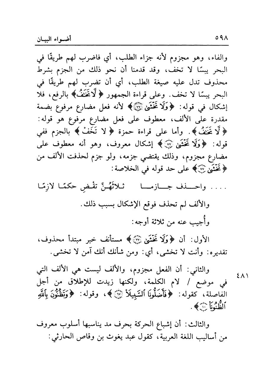 والفاء، وهو مجزوم لأنه جزاء الطلب، أي فاضرب لهم طريقًا في البحر يبسًا لا تخف، وقد قدمنا أن نحو ذلك من الجزم بشرط محذوف تدل عليه صيغة الطلب، أي أن تضرب لهم طريقًا في البحر يبسًا لا تخف. وعلى قراءة الجمهور {لَا تَخَفْ} بالرفع، فلا إشكال في قوله: {وَلَا تَخْشَى (٧٧)} لأنه فعل مضارع مرفوع بضمة مقدرة على الألف، معطوف على فعل مضارع مرفوع هو قوله: {لَا تَخَافُ}. وأما على قراءة حمزة {لَا تَخَفْ} بالجزم ففي قوله: {وَلَا تَخْشَى (٧٧)} إشكال معروف، وهو أنه معطوف على مضارع مجزوم، وذلك يقتضي جزمه، ولو جزم لحذفت الألف من {تَخْشَى (٧٧)} على حد قوله في الخلاصة: