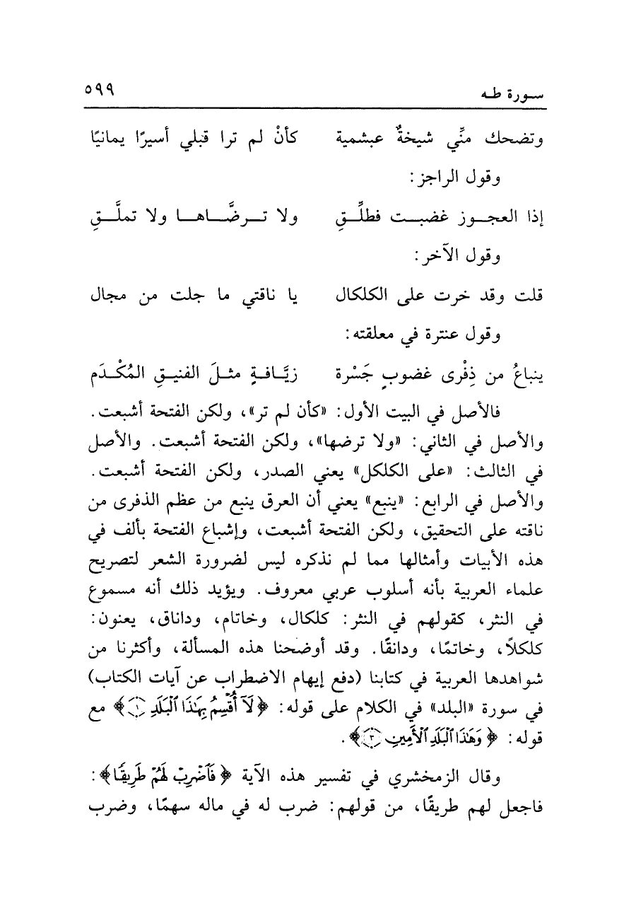 فالأصل في البيت الأول: "كأن لم تر"، ولكن الفتحة أشبعت. والأصل في الثاني: "ولا ترضها"، ولكن الفتحة أشبعت. والأصل في الثالث: "على الكلكل" يعني الصدر، ولكن الفتحة أشبعت. والأصل في الرابع: "ينبع" يعني أن العرق ينبع من عظم الذفرى من ناقته على التحقيق، ولكن الفتحة أشبعت، وإشباع الفتحة بألف في هذه الأبيات وأمثالها مما لم نذكره ليس لضرورة الشعر لتصريح علماء العربية بأنه أسلوب عربي معروف. ويؤيد ذلك أنه مسموع في النثر، كقولهم في النثر: كلكال، وخاتام، وداناق، يعنون: كلكلًا، وخاتمًا، ودانقًا. وقد أوضحنا هذه المسألة، وأكثرنا من شواهدها العربية في كتابنا (دفع إيهام الاضطراب عن آيات الكتاب) في سورة "البلد" في الكلام على قوله: {لَا أُقْسِمُ بِهَذَا الْبَلَدِ (١)} مع قوله: {وَهَذَا الْبَلَدِ الْأَمِينِ (٣)}.