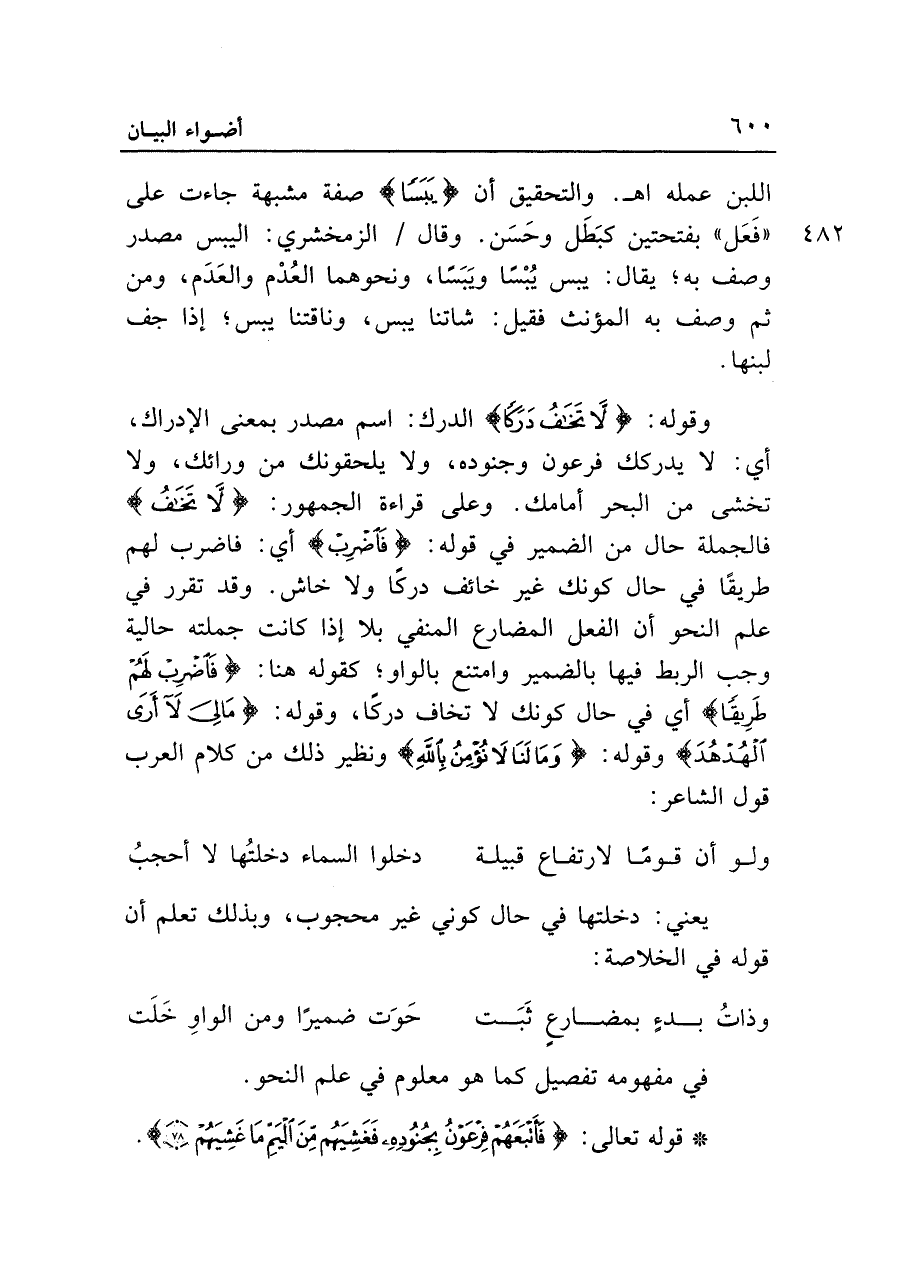 وقوله: {لَا تَخَافُ دَرَكًا} الدرك: اسم مصدر بمعنى الإدراك، أي: لا يدركك فرعون وجنوده، ولا يلحقونك من ورائك، ولا تخشى من البحر أمامك. وعلى قراءة الجمهور: {لَا تَخَفْ} فالجملة حال من الضمير في قوله: {فَاضْرِبْ} أي: فاضرب لهم طريقًا في حال كونك غير خائف دركًا ولا خاش. وقد تقرر في علم النحو أن الفعل المضارع المنفي بلا إذا كانت جملته حالية وجب الربط فيها بالضمير وامتنع بالواو؛ كقوله هنا: {فَاضْرِبْ لَهُمْ طَرِيقًا} أي في حال كونك لا تخاف دركًا، وقوله: {مَا لِيَ لَا أَرَى الْهُدْهُدَ} وقوله: {وَمَا لَنَا لَا نُؤْمِنُ بِاللَّهِ} ونظير ذلك من كلام العرب قول الشاعر: