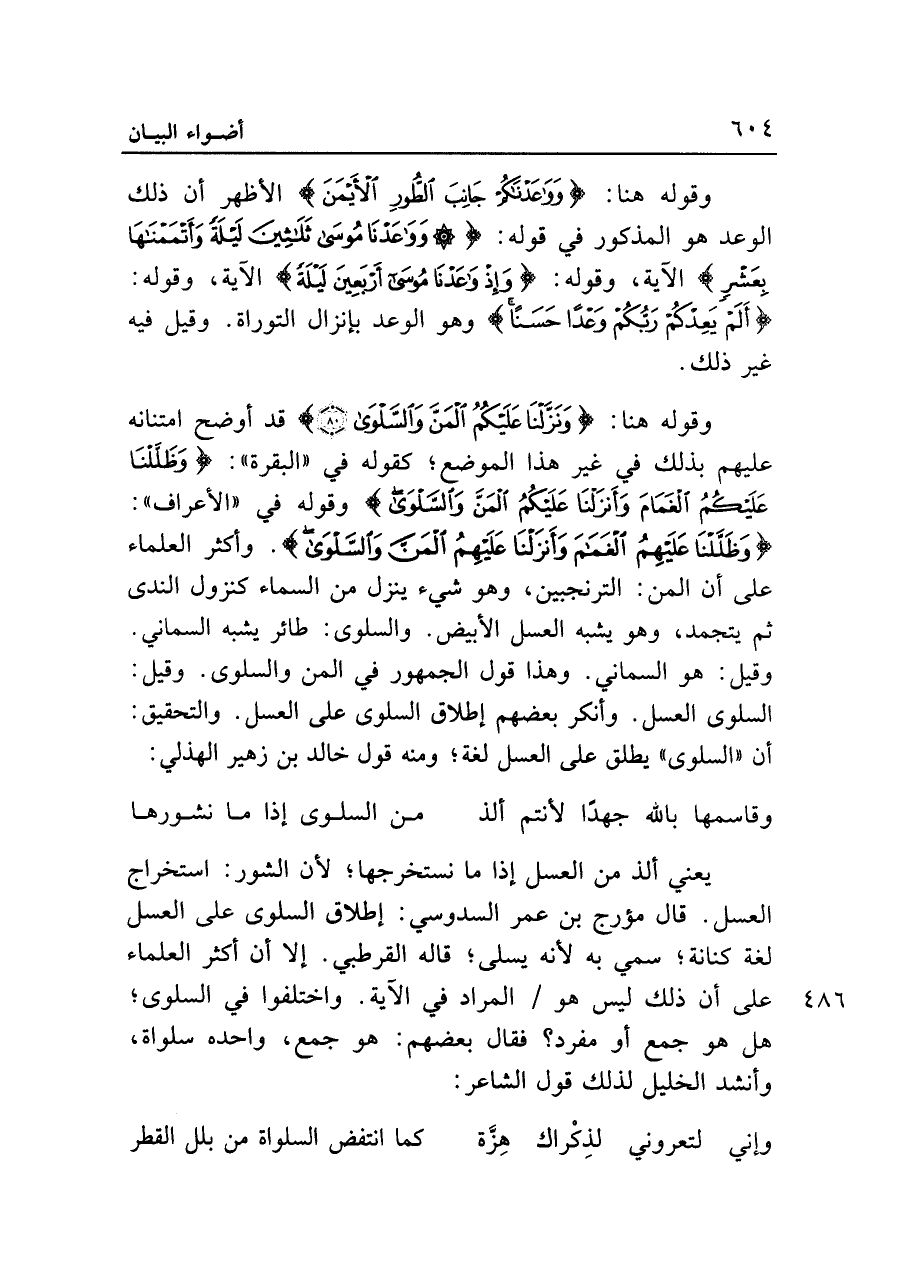 وقوله هنا: {وَنَزَّلْنَا عَلَيكُمُ الْمَنَّ وَالسَّلْوَى (٨٠)} قد أوضح امتنانه عليهم بذلك في غير هذا الموضع؛ كقوله في "البقرة": {وَظَلَّلْنَا عَلَيكُمُ الْغَمَامَ وَأَنْزَلْنَا عَلَيكُمُ الْمَنَّ وَالسَّلْوَى} وقوله في "الأعراف": {وَظَلَّلْنَا عَلَيكُمُ الْغَمَامَ وَأَنْزَلْنَا عَلَيكُمُ الْمَنَّ وَالسَّلْوَى}. وأكثر العلماء على أن المن: الترنجبين، وهو شيء ينزل من السماء كنزول الندى ثم يتجمد، وهو يشبه العسل الأبيض. والسلوى: طائر يشبه السماني. وقيل: هو السماني. وهذا قول الجمهور في المن والسلوى. وقيل: السلوى العسل. وأنكر بعضهم إطلاق السلوى على العسل. والتحقيق: أن "السلوى" يطلق على العسل لغة؛ ومنه قول خالد بن زهير الهذلي: