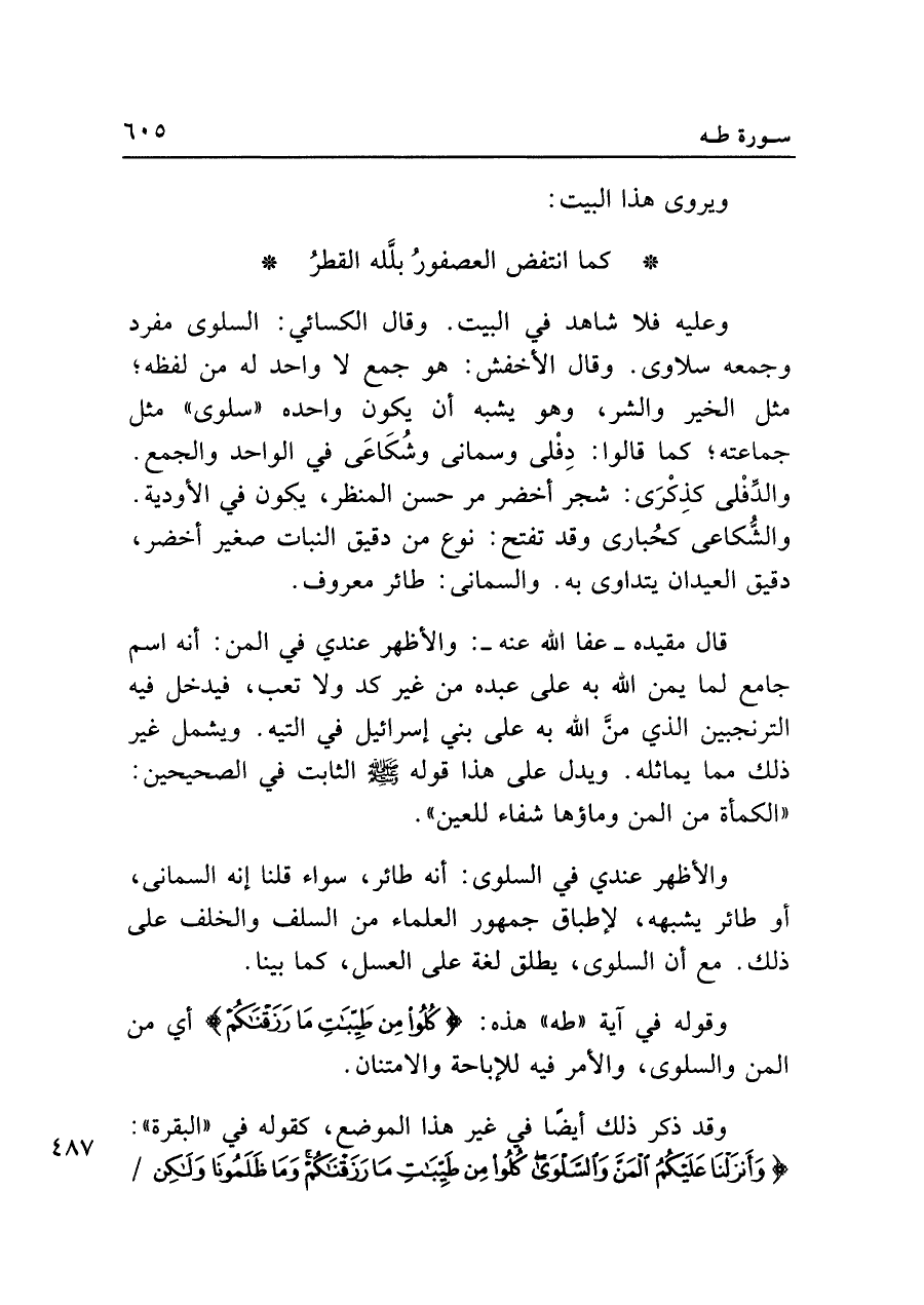 وعليه فلا شاهد في البيت. وقال الكسائي: السلوى مفرد وجمعه سلاوى. وقال الأخفش: هو جمع لا واحد له من لفظه؛ مثل الخير والشر، وهو يشبه أن يكون واحده "سلوى" مثل جماعته؛ كما قالوا: دِفْلى وسمانى وشُكَاعَى في الواحد والجمع. والدِّفْلى كذِكْرَى: شجر أخضر مر حسن المنظر، يكون في الأودية. والشُّكاعى كحُبارى وقد تفتح: نوع من دقيق النبات صغير أخضر، دقيق العيدان يتداوى به. والسمانى: طائر معروف.