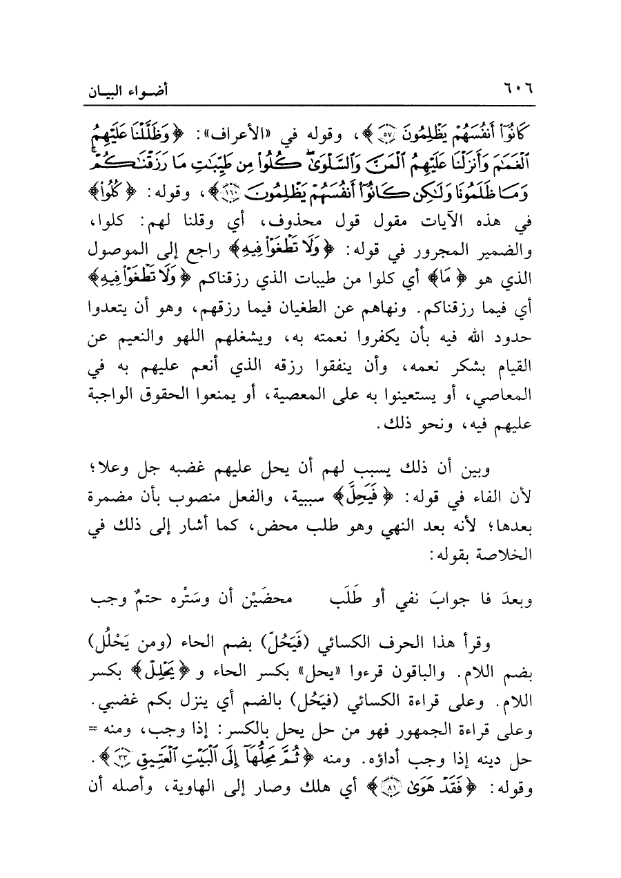 وبين أن ذلك يسبب لهم أن يحل عليهم غضبه جل وعلا؛ لأن الفاء في قوله: {فَيَحِلَّ} سببية، والفعل منصوب بأن مضمرة بعدها؛ لأنه بعد النهي وهو طلب محض، كما أشار إلى ذلك في الخلاصة بقوله: