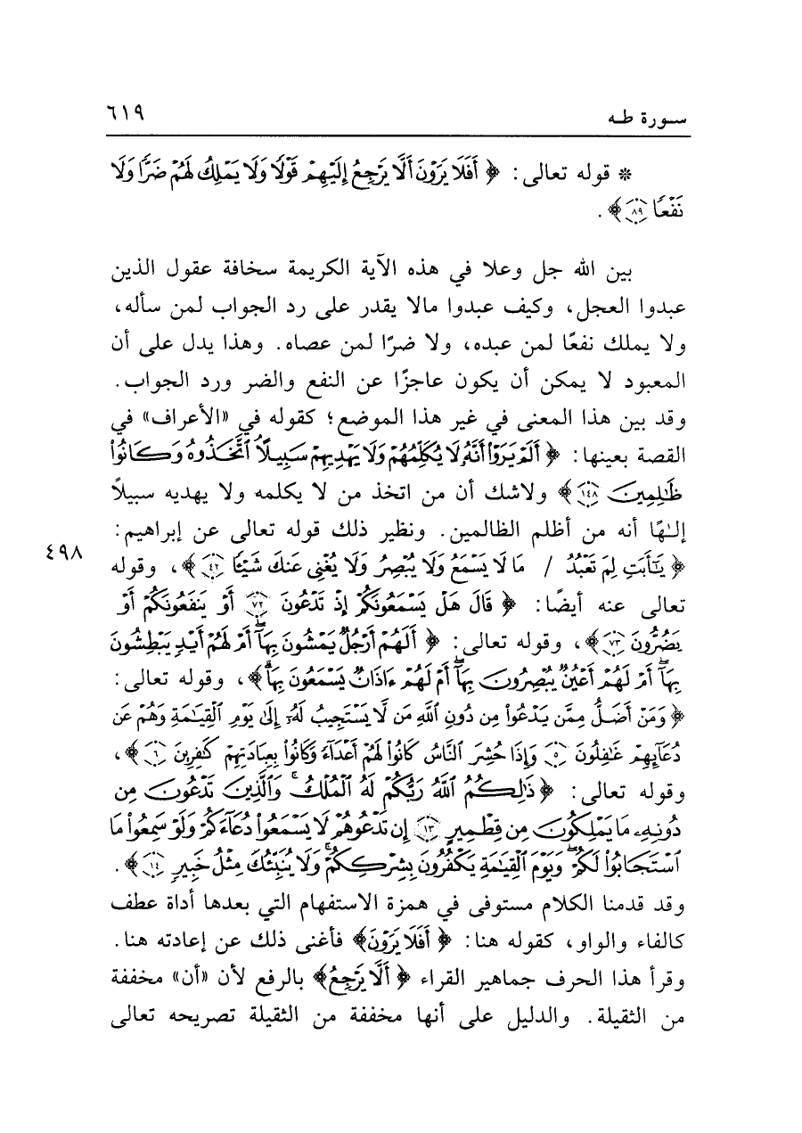 • قوله تعالى: {أَفَلَا يَرَوْنَ أَلَّا يَرْجِعُ إِلَيهِمْ قَوْلًا وَلَا يَمْلِكُ لَهُمْ ضَرًّا وَلَا نَفْعًا (٨٩)}.