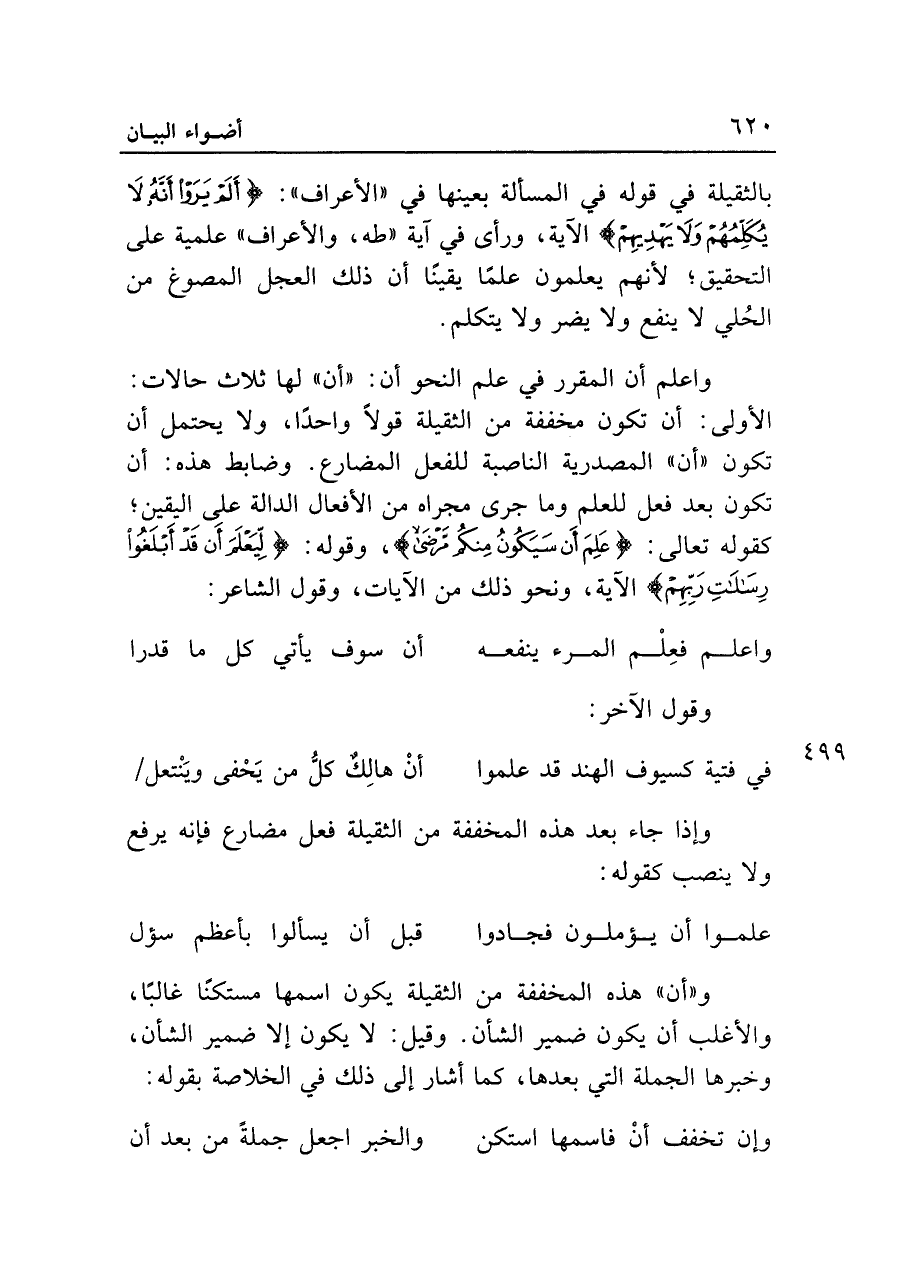 واعلم أن المقرر في علم النحو أن: "أن" لها ثلاث حالات: الأولى: أن تكون مخففة من الثقيلة قولًا واحدًا، ولا يحتمل أن تكون "أن" المصدرية الناصبة للفعل المضارع. وضابط هذه: أن تكون بعد فعل للعلم وما جرى مجراه من الأفعال الدالة على اليقين؛ كقوله تعالى: {عَلِمَ أَنْ سَيَكُونُ مِنْكُمْ مَرْضَى}، وقوله: {لِيَعْلَمَ أَنْ قَدْ أَبْلَغُوا رِسَالاتِ رَبِّهِمْ} الآية، ونحو ذلك من الآيات، وقول الشاعر: