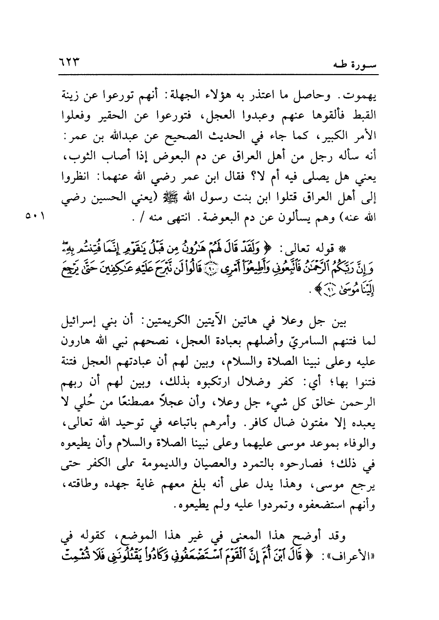 يهموت. وحاصل ما اعتذر به هؤلاء الجهلة: أنهم تورعوا عن زينة القبط فألقوها عنهم وعبدوا العجل، فتورعوا عن الحقير وفعلوا الأمر الكبير، كما جاء في الحديث الصحيح عن عبد الله بن عمر: أنه سأله رجل من أهل العراق عن دم البعوض إذا أصاب الثوب، يعني هل يصلى فيه أم لا؟ فقال ابن عمر رضي الله عنهما: انظروا إلى أهل العراق قتلوا ابن بنت رسول الله - صلى الله عليه وسلم - (يعني الحسين رضي الله عنه) وهم يسألون عن دم البعوضة. انتهى منه.