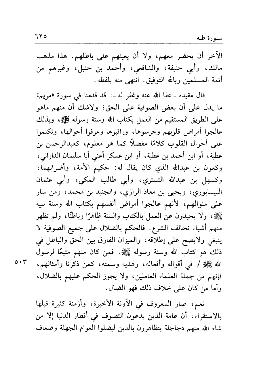 قال مقيده -عفا الله عنه وغفر له-: قد قدمنا في سورة "مريم" ما يدل على أن بعض الصوفية على الحق؛ ولا شك أن منهم ما هو على الطريق المستقيم من العمل بكتاب الله وسنة رسوله - صلى الله عليه وسلم -، وبذلك عالجوا أمراض قلوبهم وحرسوها، وراقبوها وعرفوا أحوالها، وتكلموا على أحوال القلوب كلامًا مفصلًا كما هو معلوم، كعبد الرحمن بن عطية، أو ابن أحمد بن عطية، أو ابن عسكر أعني أبا سليمان الداراني، وكعون بن عبد الله الذي كان يقال له: حكيم الأمة، وأضرابهما، وكسهل بن عبد الله التستري، وأبي طالب المكي، وأبي عثمان النيسابوري، ويحيى بن معاذ الرازي، والجنيد بن محمد، ومن سار على منوالهم، لأنهم عالجوا أمراض أنفسهم بكتاب الله وسنة نبيه - صلى الله عليه وسلم -، ولا يحيدون عن العمل بالكتاب والسنة ظاهرًا وباطنًا، ولم تظهر منهم أشياء تخالف الشرع. فالحكم بالضلال على جميع الصوفية لا ينبغي ولا يصح على إطلاقه، والميزان الفارق بين الحق والباطل في ذلك هو كتاب الله وسنة رسوله - صلى الله عليه وسلم -. فمن كان منهم متبعًا لرسول الله - صلى الله عليه وسلم - في أقواله وأفعاله، وهديه وسمته، كمن ذكرنا وأمثالهم، فإنهم من جملة العلماء العاملين، ولا يجوز الحكم عليهم بالضلال، وأما من كان على خلاف ذلك فهو الضال.