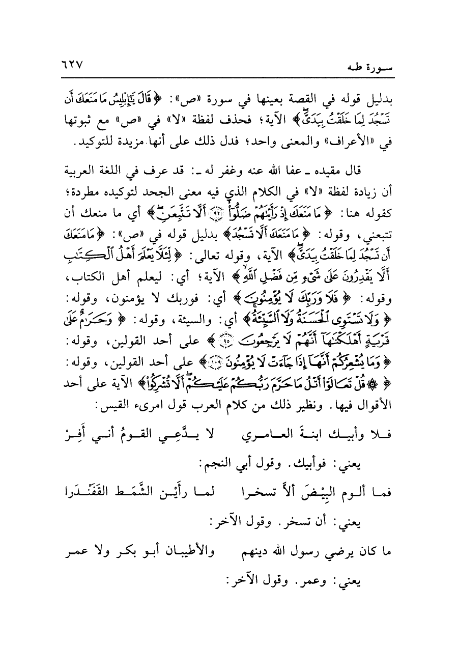 قال مقيده -عفا الله عنه وغفر له-: قد عرف في اللغة العربية أن زيادة لفظة "لا" في الكلام الذي فيه معنى الجحد لتوكيده مطردة؛ كقوله هنا: {مَا مَنَعَكَ إِذْ رَأَيتَهُمْ ضَلُّوا (٩٢) أَلَّا تَتَّبِعَنِ} أي ما منعك أن تتبعني، وقوله: {مَا مَنَعَكَ أَنْ تَسْجُدَ} بدليل قوله في "ص": {مَا مَنَعَكَ أَنْ تَسْجُدَ لِمَا خَلَقْتُ بِيَدَيَّ} الآية، وقوله تعالى: {لِئَلَّا يَعْلَمَ أَهْلُ الْكِتَابِ أَلَّا يَقْدِرُونَ عَلَى شَيءٍ مِنْ فَضْلِ اللَّهِ} الآية؛ أي: ليعلم أهل الكتاب، وقوله: {فَلَا وَرَبِّكَ لَا يُؤْمِنُونَ} أي: فوربك لا يؤمنون، وقوله: {وَلَا تَسْتَوي الْحَسَنَةُ وَلَا السَّيِّئَةُ} أي: والسيئة، وقوله: {وَحَرَامٌ عَلَى قَرْيَةٍ أَهْلَكْنَاهَا أَنَّهُمْ لَا يَرْجِعُونَ (٩٥)} على أحد القولين، وقوله: {وَمَا يُشْعِرُكُمْ أَنَّهَا إِذَا جَاءَتْ لَا يُؤْمِنُونَ (١٠٩)} على أحد القولين، وقوله: {قُلْ تَعَالوْا أَتْلُ مَا حَرَّمَ رَبُّكُمْ عَلَيكُمْ أَلَّا تُشْرِكُوا} الآية على أحد الأقوال فيها. ونظير ذلك من كلام العرب قول امرئ القيس: