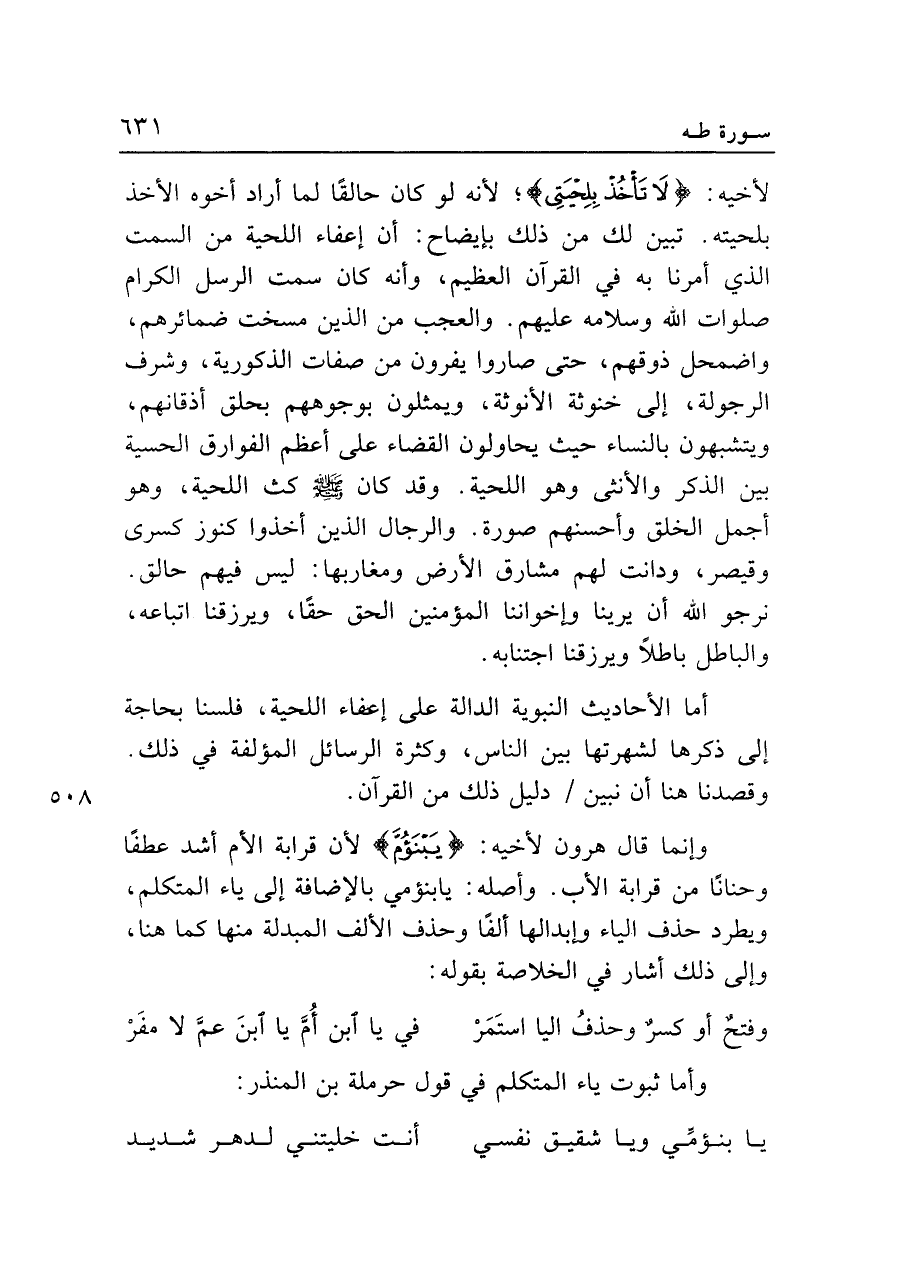 لأخيه: {لَا تَأْخُذْ بِلِحْيَتِي}؛ لأنه لو كان حالقًا لما أراد أخوه الأخذ بلحيته. تبين لك من ذلك بإيضاح: أن إعفاء اللحية من السمت الذي أمرنا به في القرآن العظيم، وأنه كان سمت الرسل الكرام صلوات الله وسلامه عليهم. والعجب من الذين مسخت ضمائرهم، واضمحل ذوقهم، حتى صاروا يفرون من صفات الذكورية، وشرف الرجولة، إلى خنوثة الأنوثة، ويمثلون بوجوههم بحلق أذقانهم، ويتشبهون بالنساء حيث يحاولون القضاء على أعظم الفوارق الحسية بين الذكر والأنثى وهو اللحية. وقد كان - صلى الله عليه وسلم - كث اللحية، وهو أجمل الخلق وأحسنهم سورة. والرجال الذين أخذوا كنوز كسرى وقيصر، ودانت لهم مشارق الأرض ومغاربها: ليس فيهم حالق. نرجو الله أن يرينا وإخواننا المؤمنين الحق حقًّا، ويرزقنا اتباعه، والباطل باطلًا ويرزقنا اجتنابه.