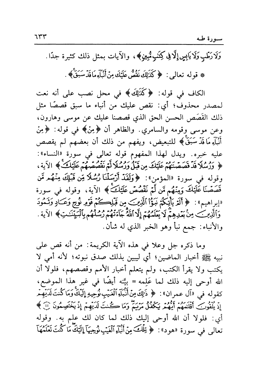 الكاف في قوله: {كَذَلِكَ} في محل نصب على أنه نعت لمصدر محذوف، أي: نقص عليك من أنباء ما سبق قصصًا مثل ذلك القَصَص الحسن الحق الذي قصصنا عليك عن موسى وهارون، وعن موسى وقومه والسامري. والظاهر أن {مِنْ} في قوله: {مِنْ أَنْبَاءِ مَا قَدْ سَبَقَ} للتبعيض، ويفهم من ذلك أن بعضهم لم يقصص عليه خبره. ويدل لهذا المفهوم قوله تعالى في سورة "النساء": {وَرُسُلًا قَدْ قَصَصْنَاهُمْ عَلَيكَ مِنْ قَبْلُ وَرُسُلًا لَمْ نَقْصُصْهُمْ عَلَيكَ} الآية، وقوله في سورة "المؤمن": {وَلَقَدْ أَرْسَلْنَا رُسُلًا مِنْ قَبْلِكَ مِنْهُمْ مَنْ قَصَصْنَا عَلَيكَ وَمِنْهُمْ مَنْ لَمْ نَقْصُصْ عَلَيكَ} الآية، وقوله في سورة "إبراهيم": {أَلَمْ يَأْتِكُمْ نَبَأُ الَّذِينَ مِنْ قَبْلِكُمْ قَوْمِ نُوحٍ وَعَادٍ وَثَمُودَ وَالَّذِينَ مِنْ بَعْدِهِمْ لَا يَعْلَمُهُمْ إلا اللَّهُ جَاءَتْهُمْ رُسُلُهُمْ بِالْبَيِّنَاتِ} الآية. والأنباء: جمع نبأ وهو الخبر الذي له شأن.