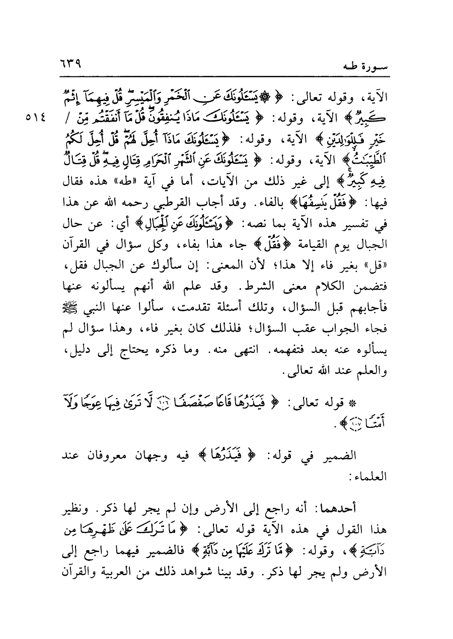 الآية، وقوله تعالى: {يَسْأَلُونَكَ عَنِ الْخَمْرِ وَالْمَيسِرِ قُلْ فِيهِمَا إِثْمٌ كَبِيرٌ} الآية، وقوله: {يَسْأَلُونَكَ مَاذَا يُنْفِقُونَ قُلْ مَا أَنْفَقْتُمْ مِنْ خَيرٍ فَلِلْوَالِدَينِ} الآية، وقوله: {يَسْأَلُونَكَ مَاذَا أُحِلَّ لَهُمْ قُلْ أُحِلَّ لَكُمُ الطَّيِّبَاتُ} الآية، وقوله: {يَسْأَلُونَكَ عَنِ الشَّهْرِ الْحَرَامِ قِتَالٍ فِيهِ قُلْ قِتَالٌ فِيهِ كَبِيرٌ} إلى غير ذلك من الآيات، أما في آية "طه" هذه فقال فيها: {فَقُلْ يَنْسِفُهَا} بالفاء. وقد أجاب القرطبي رحمه الله عن هذا في تفسير هذه الآية بما نصه: {وَيَسْأَلُونَكَ عَنِ الْجِبَالِ} أي: عن حال الجبال يوم القيامة {فَقُل} جاء هذا بفاء، وكل سؤال في القرآن "قل" بغير فاء إلا هذا؛ لأن المعنى: إن سألوك عن الجبال فقل، فتضمن الكلام معنى الشرط. وقد علم الله أنهم يسألونه عنها فأجابهم قبل السؤال، وتلك أسئلة تقدمت، سألوا عنها النبي - صلى الله عليه وسلم - فجاء الجواب عقب السؤال؛ فلذلك كان بغير فاء، وهذا سؤال لم يسألوه عنه بعد فتفهمه. انتهى منه. وما ذكره يحتاج إلى دليل، والعلم عند الله تعالى.