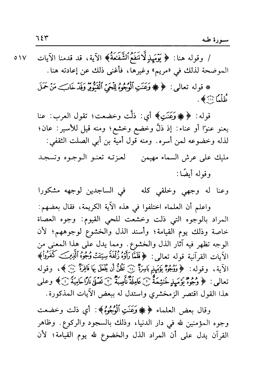 واعلم أن العلماء اختلفوا في هذه الآية الكريمة، فقال بعضهم: المراد بالوجوه التي ذلت وخشعت للحي القيوم: وجوه العصاة خاصة وذلك يوم القيامة؛ وأسند الذل والخشوع لوجوههم؛ لأن الوجه تظهر فيه آثار الذل والخشوع. ومما يدل على هذا المعنى من الآيات القرآنية قوله تعالى: {فَلَمَّا رَأَوْهُ زُلْفَةً سِيئَتْ وُجُوهُ الَّذِينَ كَفَرُوا} الآية، وقوله: {وَوُجُوهٌ يَوْمَئِذٍ بَاسِرَةٌ (٢٤) تَظُنُّ أَنْ يُفْعَلَ بِهَا فَاقِرَةٌ (٢٥)}، وقوله تعالى: {وُجُوهٌ يَوْمَئِذٍ خَاشِعَةٌ (٢) عَامِلَةٌ نَاصِبَةٌ (٣) تَصْلَى نَارًا حَامِيَةً} وعلى هذا القول اقتصر الزمخشري واستدل له ببعض الآيات المذكورة.