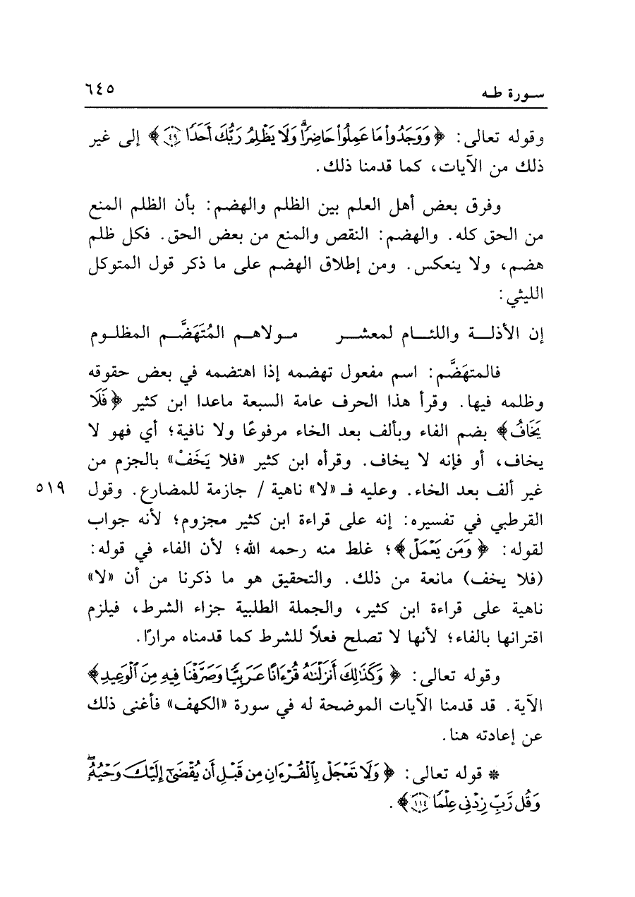 فالمتهضَّم: اسم مفعول تهضمه إذا اهتضمه في بعض حقوقه وظلمه فيها. وقرأ هذا الحرف عامة السبعة ماعدا ابن كثير {فَلَا يَخَافُ} بضم الفاء وبألف بعد الخاء مرفوعًا ولا نافية؛ أي فهو لا يخاف، أو فإنه لا يخاف. وقرأه ابن كثير "فلا يَخَفْ" بالجزم من غير ألف بعد الخاء. وعليه فـ"لا" ناهية جازمة للمضارع. وقول القرطبي في تفسيره: إنه على قراءة ابن كثير مجزوم؛ لأنه جواب لقوله: {وَمَن يعمَل}؛ غلط منه رحمه الله؛ لأن الفاء في قوله: (فلا يخف) مانعة من ذلك. والتحقيق هو ما ذكرنا من أن "لا" ناهية على قراءة ابن كثير، والجملة الطلبية جزاء الشرط، فيلزم اقترانها بالفاء؛ لأنها لا تصلح فعلًا للشرط كما قدمناه مرارًا.