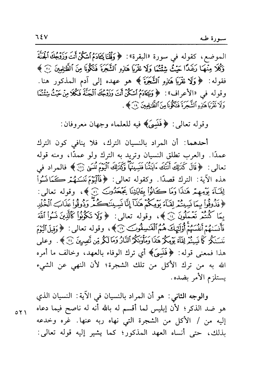أحدهما: أن المراد بالنسيان الترك، فلا ينافي كون الترك عمدًا. والعرب تطلق النسيان وتريد به الترك ولو عمدًا، ومنه قوله تعالى: {قَال كَذَلِكَ أَتَتْكَ آيَاتُنَا فَنَسِيتَهَا وَكَذَلِكَ الْيَوْمَ تُنْسَى (١٢٦)} فالمراد في هذه الآية: الترك قصدًا. وكقوله تعالى: {فَالْيَوْمَ نَنْسَاهُمْ كَمَا نَسُوا لِقَاءَ يَوْمِهِمْ هَذَا وَمَا كَانُوا بِآيَاتِنَا يَجْحَدُونَ (٥١)}، وقوله تعالى: {فَذُوقُوا بِمَا نَسِيتُمْ لِقَاءَ يَوْمِكُمْ هَذَا إِنَّا نَسِينَاكُمْ وَذُوقُوا عَذَابَ الْخُلْدِ بِمَا كُنْتُمْ تَعْمَلُونَ (١٤)}، وقوله تعالى: {وَلَا تَكُونُوا كَالَّذِينَ نَسُوا اللَّهَ فَأَنْسَاهُمْ أَنْفُسَهُمْ أُولَئِكَ هُمُ الْفَاسِقُونَ (١٩)}، وقوله تعالى: {وَقِيلَ الْيَوْمَ نَنْسَاكُمْ كَمَا نَسِيتُمْ لِقَاءَ يَوْمِكُمْ هَذَا وَمَأْوَاكُمُ النَّارُ وَمَا لَكُمْ مِنْ نَاصِرِينَ (٣٤)}: وعلى هذا فمعنى قوله: {فَنسَى} أي ترك الوفاء بالعهد، وخالف ما أمره الله به من ترك الأكل من تلك الشجرة؛ لأن النهي عن الشيء يستلزم الأمر بضده.