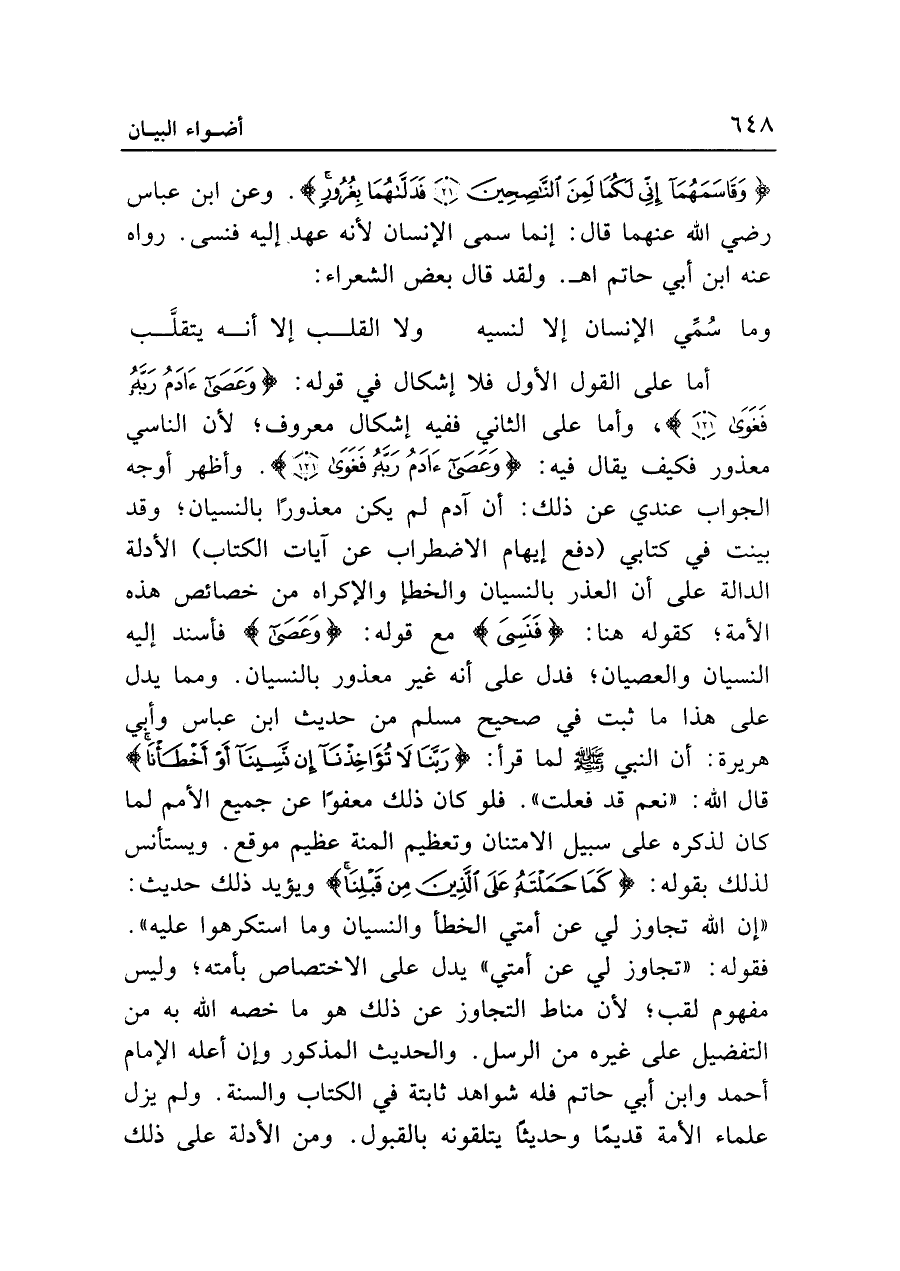 أما على القول الأول فلا إشكال في قوله: {وَعَصَى آدَمُ رَبَّهُ فَغَوَى (١٢١)}، وأما على الثاني ففيه إشكال معروف؛ لأن الناسي معذور فكيف يقال فيه: {وَعَصَى آدَمُ رَبَّهُ فَغَوَى (١٢١)}. وأظهر أوجه الجواب عندي عن ذلك: أن آدم لم يكن معذورًا بالنسيان، وقد بينت في كتابي (دفع إيهام الاضطراب عن آيات الكتاب) الأدلة الدالة على أن العذر بالنسيان والخطإ والإكراه من خصائص هذه الأمة، كقوله هنا: {فَنسَى} مع قوله: {وَعَصَى} فأسند إليه النسيان والعصيان؛ فدل على أنه غير معذور بالنسيان. ومما يدل على هذا ما ثبت في صحيح مسلم من حديث ابن عباس وأبي هريرة: أن النبي - صلى الله عليه وسلم - لما قرأ: {رَبَّنَا لَا تُؤَاخِذْنَا إِنْ نَسِينَا أَوْ أَخْطَأْنَا} قال الله: "نعم قد فعلت". فلو كان ذلك معفوًا عن جميع الأمم لما كان لذكره على سبيل الامتنان وتعظيم المنة عظيم موقع. ويستأنس لذلك بقوله: {كَمَا حَمَلْتَهُ عَلَى الَّذِينَ مِنْ قَبْلِنَا} ويؤيد ذلك حديث: "إن الله تجاوز لي عن أمتي الخطأ والنسيان وما استكرهوا عليه". فقوله: "تجاوز لي عن أمتي" يدل على الاختصاص بأمته، وليس مفهوم لقب؛ لأن مناط التجاوز عن ذلك هو ما خصه الله به من التفضيل على غيره من الرسل. والحديث المذكور وإن أعله الإمام أحمد وابن أبي حاتم فله شواهد ثابتة في الكتاب والسنة. ولم يزل علماء الأمة قديمًا وحديثًا يتلقونه بالقبول. ومن الأدلة على ذلك