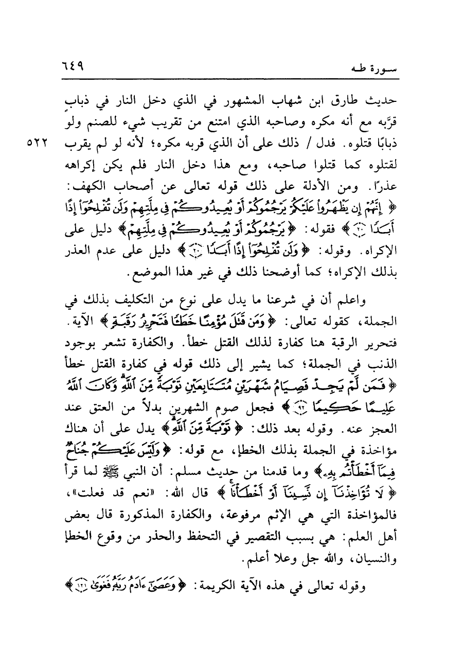 واعلم أن في شرعنا ما يدل على نوع من التكليف بذلك في الجملة، كقوله تعالى: {وَمَنْ قَتَلَ مُؤْمِنًا خَطَأ فَتَحْرِيرُ رَقَبَةٍ} الآية. فتحرير الرقبة هنا كفارة لذلك القتل خطأ. والكفارة تشعر بوجود الذنب في الجملة؛ كما يشير إلى ذلك قوله في كفارة القتل خطأ {فَمَنْ لَمْ يَجِدْ فَصِيَامُ شَهْرَينِ مُتَتَابِعَينِ تَوْبَةً مِنَ اللَّهِ وَكَانَ اللَّهُ عَلِيمًا حَكِيمًا (٩٢)} فجعل صوم الشهرين بدلًا من العتق عند العجز عنه. وقوله بعد ذلك: {تَوْبَةً مِنَ اللَّهِ} يدل على أن هناك مؤاخذة في الجملة بذلك الخطإ، مع قوله: {وَلَيسَ عَلَيكُمْ جُنَاحٌ فِيمَا أَخْطَأْتُمْ بِهِ} وما قدمنا من حديث مسلم: أن النبي - صلى الله عليه وسلم - لما قرأ {لَا تُؤَاخِذْنَا إِنْ نَسِينَا أَوْ أَخْطَأْنَا} قال الله: "نعم قد فعلت"، فالمؤاخذة التي هي الإثم مرفوعة، والكفارة المذكورة قال بعض أهل العلم: هي بسبب التقصير في التحفظ والحذر من وقوع الخطإ والنسيان، والله جل وعلا أعلم.
