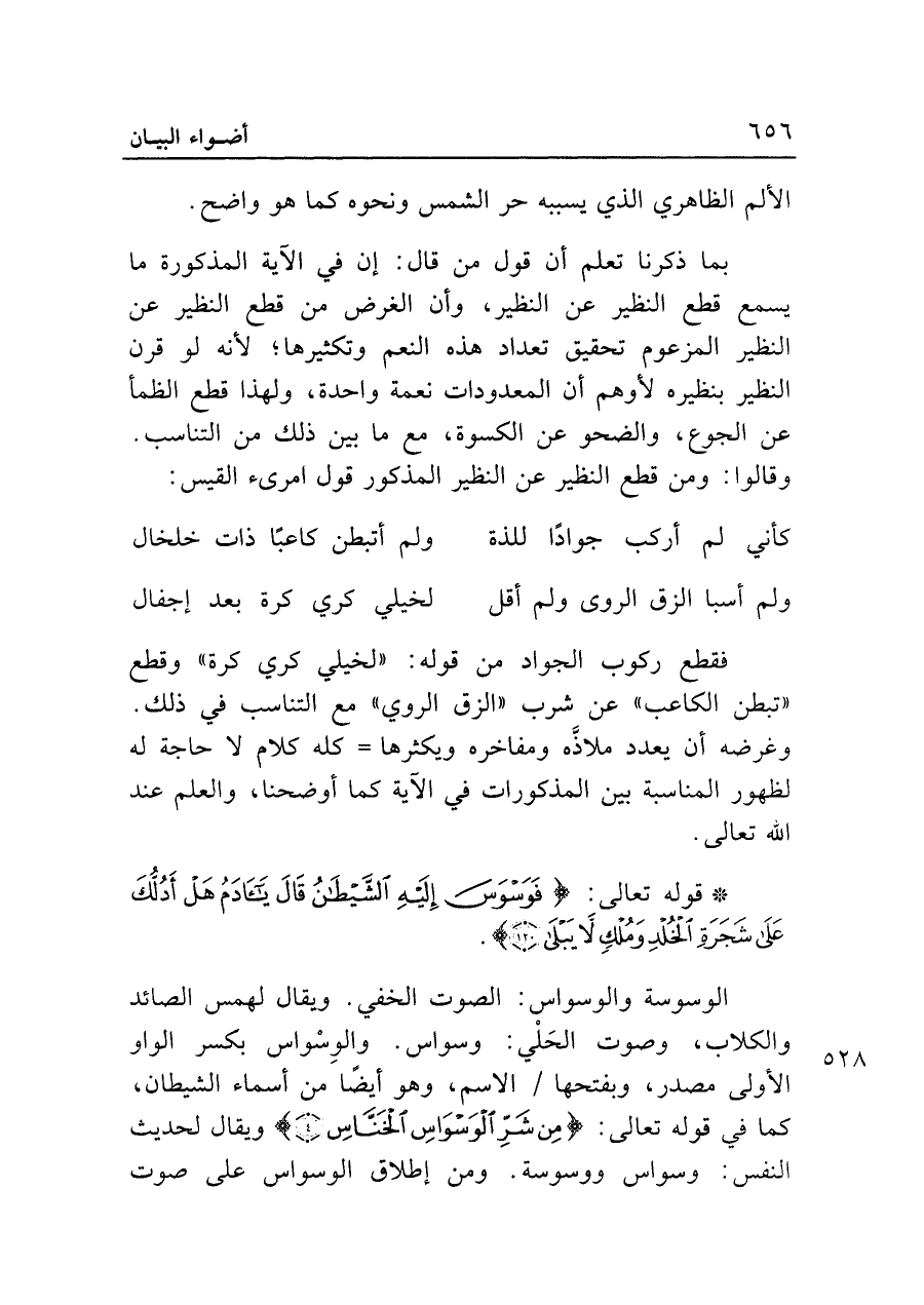 فقطع ركوب الجواد من قوله: "لخيلي كري كرة" وقطع "تبطن الكاعب" عن شرب "الزق الروي" مع التناسب في ذلك. وغرضه أن يعدد ملاذَّه ومفاخره ويكثرها = كله كلام لا حاجة له لظهور المناسبة بين المذكورات في الآية كما أوضحنا، والعلم عند الله تعالى.
