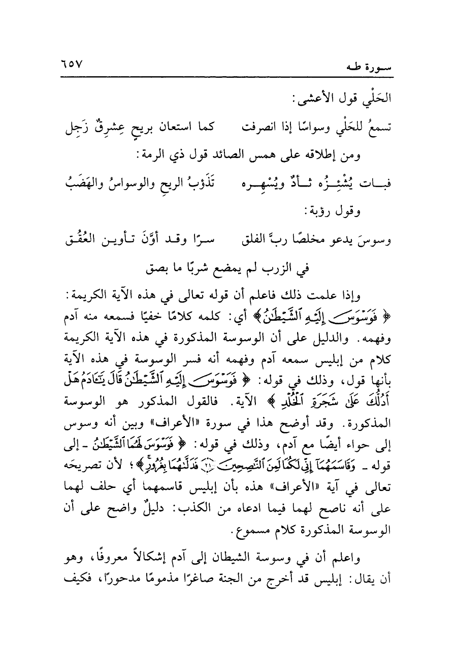 وإذا علمت ذلك فاعلم أن قوله تعالى في هذه الآية الكريمة: {فَوَسْوَسَ إِلَيهِ الشَّيطَانُ} أي: كلمه كلامًا خفيًّا فسمعه منه آدم وفهمه. والدليل على أن الوسوسة المذكورة في هذه الآية الكريمة كلام من إبليس سمعه آدم وفهمه أنه فسر الوسوسة في هذه الآية بأنها قول، وذلك في قوله: {فَوَسْوَسَ إِلَيهِ الشَّيطَانُ قَال يَاآدَمُ هَلْ أَدُلُّكَ عَلَى شَجَرَةِ الْخُلْدِ} الآية. فالقول المذكور هو الوسوسة المذكورة. وقد أوضح هذا في سورة "الأعراف" وبين أنه وسوس إلى حواء أيضًا مع آدم، وذلك في قوله: {فَوَسْوَسَ إِلَيهِ الشَّيطَانُ -إلى قوله- وَقَاسَمَهُمَا إِنِّي لَكُمَا لَمِنَ النَّاصِحِينَ (٢١) فَدَلَّاهُمَا بِغُرُورٍ}؛ لأن تصريحَه تعالى في آية "الأعراف" هذه بأن إبليس قاسمهما أي حلف لهما على أنه ناصح لهما فيما ادعاه من الكذب: دليلٌ واضح على أن الوسوسة المذكورة كلام مسموع.