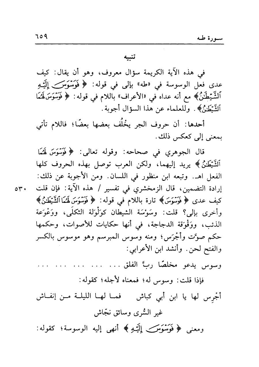 قال الجوهري في صحاحه: وقوله تعالى: {فَوَسْوَسَ لَهُمَا الشَّيطَانُ} يريد إليهما، ولكن العرب توصل بهذه الحروف كلها الفعل اهـ. وتبعه ابن منظور في اللسان. ومن الأجوبة عن ذلك: إرادة التضمين، قال الزمخشري في تفسير هذه الآية: فإن قلت كيف عدى {فَوَسْوَسَ} تارة باللام في قوله: {فَوَسْوَسَ لَهُمَا الشَّيطَانُ} وأخرى بإلى؟ قلت: وسَوْسَة الشيطان كوَلْوَلة الثكلَى، ووَعوَعة الذئب، ووَقْوَقة الدجاجة، في أنها حكايات للأصوات، وحكمها حكم صوَّت وأجْرَس؛ ومنه وسوس المبرسم وهو موسوس بالكسر والفتح لحن. وأنشد ابن الأعرابي: