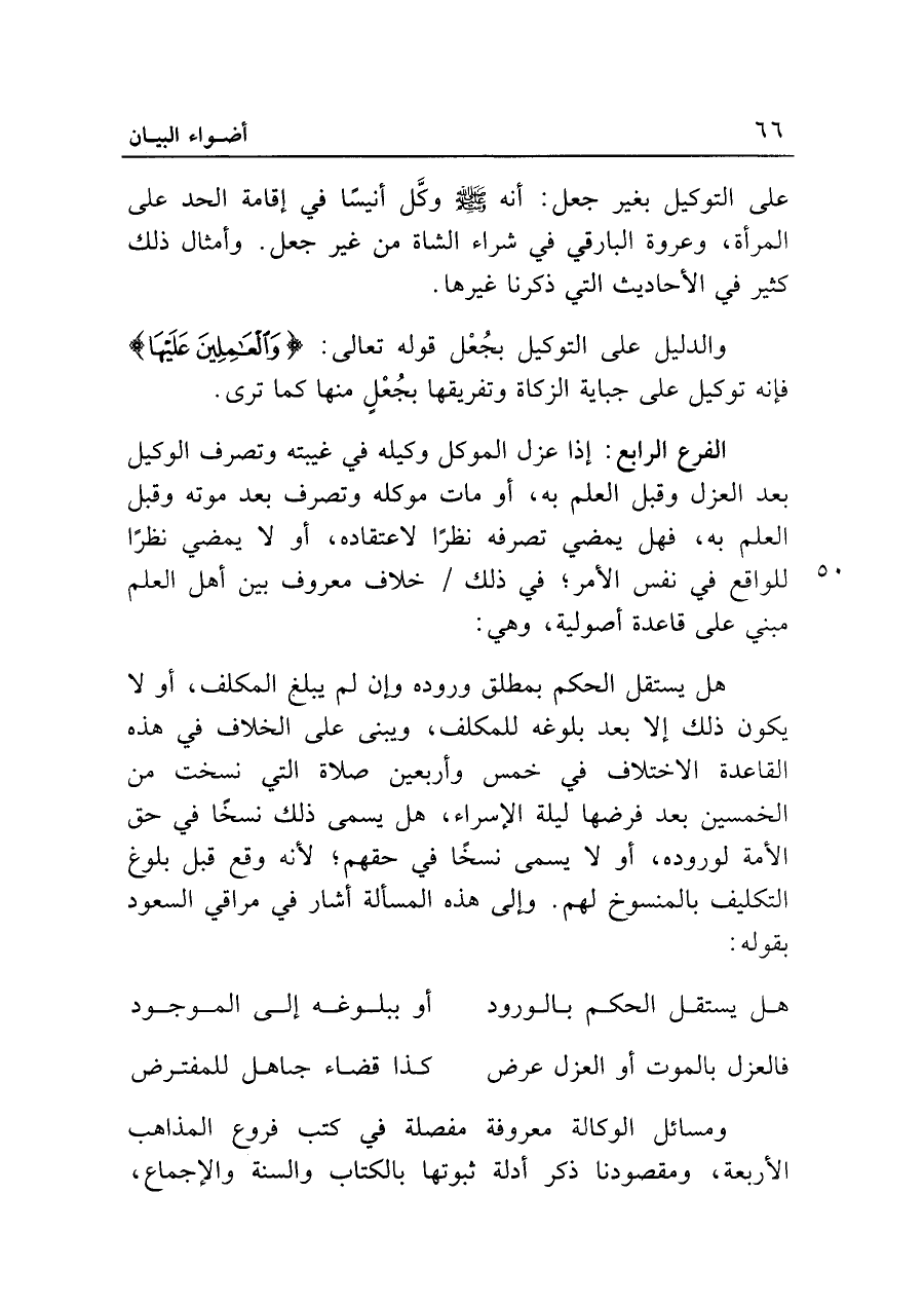 الفرع الرابع: إذا عزل الموكل وكيله في غيبته وتصرف الوكيل بعد العزل وقبل العلم به، أو مات موكله وتصرف بعد موته وقبل العلم به، فهل يمضي تصرفه نظرًا لاعتقاده، أو لا يمضي نظرًا للواقع في نفس الأمر؛ في ذلك خلاف معروف بين أهل العلم مبني على قاعدة أصولية، وهي: