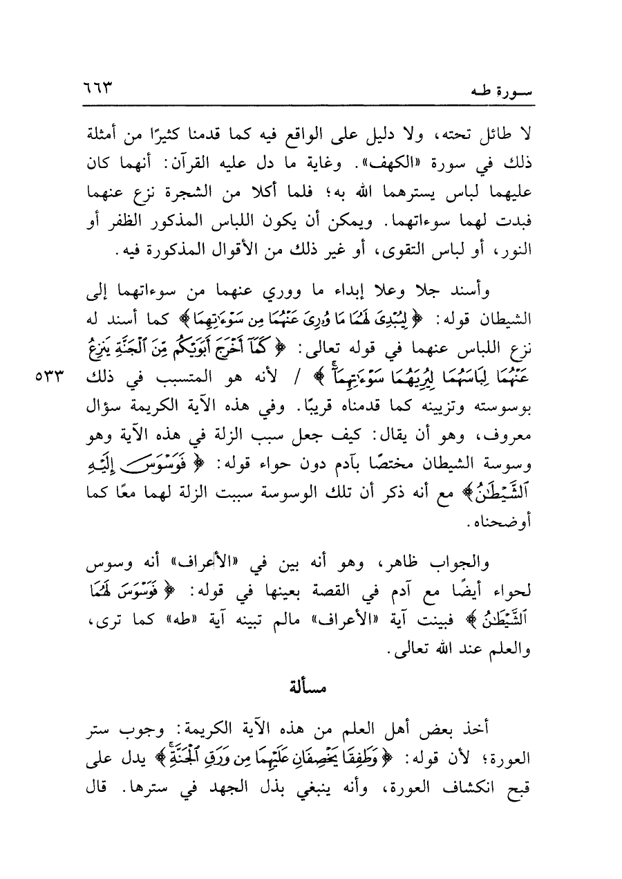 وأسند جلا وعلا إبداء ما ووري عنهما من سوءاتهما إلى الشيطان قوله: {لِيُبْدِيَ لَهُمَا مَا وُورِيَ عَنْهُمَا مِنْ سَوْآتِهِمَا} كما أسند له نزع اللباس عنهما في قوله تعالى: {كَمَا أَخْرَجَ أَبَوَيكُمْ مِنَ الْجَنَّةِ يَنْزِعُ عَنْهُمَا لِبَاسَهُمَا لِيُرِيَهُمَا سَوْآتِهِمَا} لأنه هو المتسبب في ذلك بوسوسته وتزيينه كما قدمناه قريبًا. وفي هذه الآية الكريمة سؤال معروف، وهو أن يقال: كيف جعل سبب الزلة في هذه الآية وهو وسوسة الشيطان مختصًّا بآدم دون حواء قوله: {فَوَسْوَسَ إِلَيهِ الشَّيطَانُ} مع أنه ذكر أن تلك الوسوسة سببت الزلة لهما معًا كما أوضحناه.