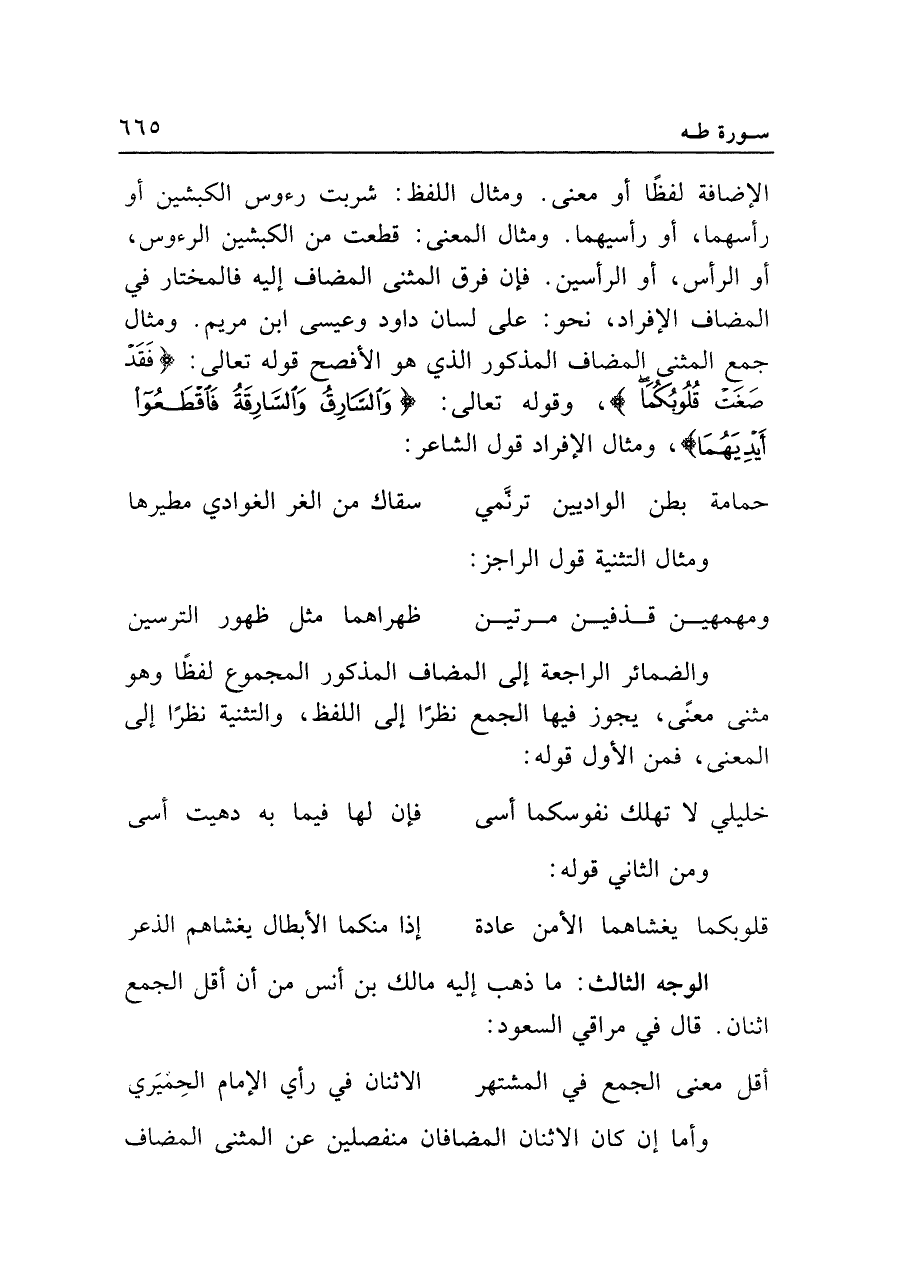 والضمائر الراجعة إلى المضاف المذكور المجموع لفظًا وهو مثنى معنًى، يجوز فيها الجمع نظرًا إلى اللفظ، والتثنية نظرًا إلى المعنى، فمن الأول قوله:
