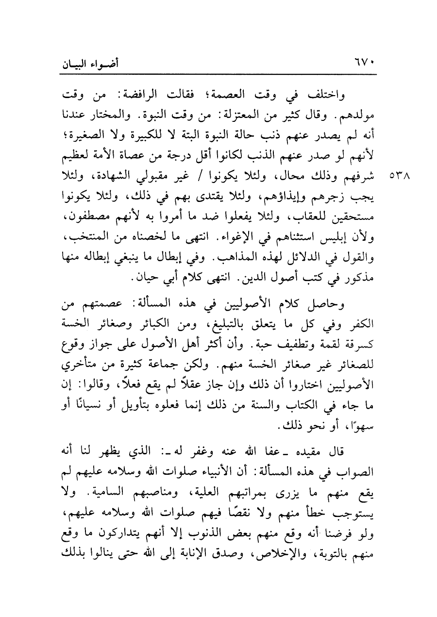 قال مقيده -عفا الله عنه وغفر له-: الذي يظهر لنا أنه الصواب في هذه المسألة: أن الأنبياء صلوات الله وسلامه عليهم لم يقع منهم ما يزرى بمراتبهم العلية، ومناصبهم السامية. ولا يستوجب خطأ منهم ولا نقصًا فيهم صلوات الله وسلامه عليهم، ولو فرضنا أنه وقع منهم بعض الذنوب إلا أنهم يتداركون ما وقع منهم بالتوبة، والإخلاص، وصدق الإنابة إلى الله حتى ينالوا بذلك