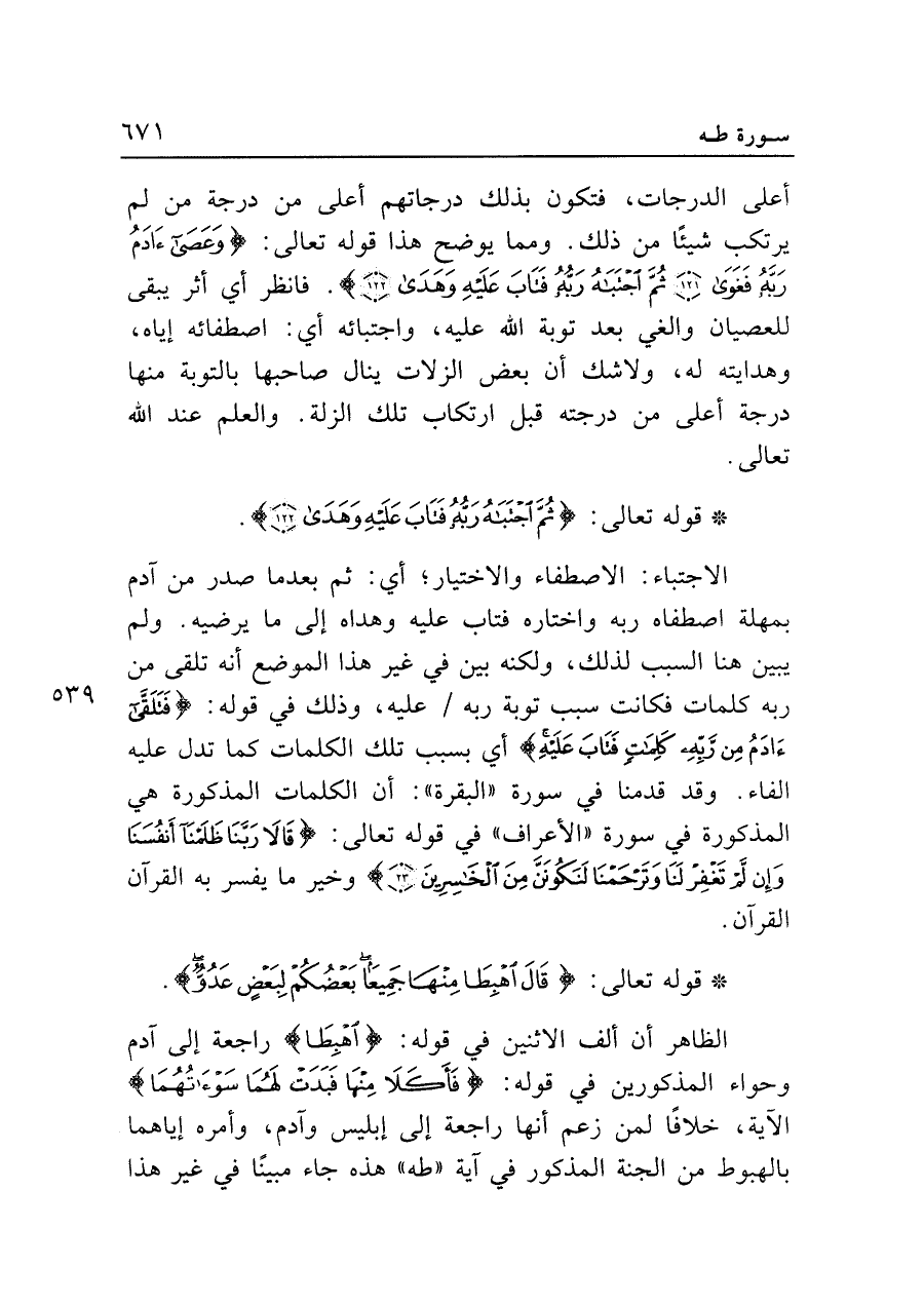 • قوله تعالى: {ثُمَّ اجْتَبَاهُ رَبُّهُ فَتَابَ عَلَيهِ وَهَدَى (١٢٢)}.