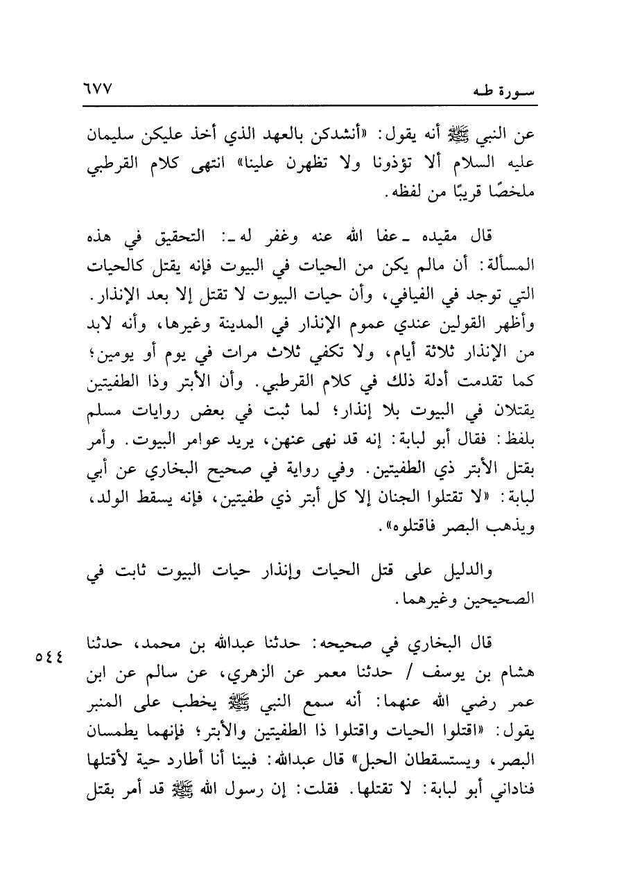 قال مقيده -عفا الله عنه وغفر له-: التحقيق في هذه المسألة: أن ما لم يكن من الحيات في البيوت فإنه يقتل كالحيات التي توجد في الفيافي، وأن حيات البيوت لا تقتل إلا بعد الإنذار. وأظهر القولين عندي عموم الإنذار في المدينة وغيرها، وأنه لابد من الإنذار ثلاثة أيام، ولا تكفي ثلاث مرات في يوم أو يومين؛ كما تقدمت أدلة ذلك في كلام القرطبي. وأن الأبتر وذا الطفيتين يقتلان في البيوت بلا إنذار؛ لما ثبت في بعض روايات مسلم بلفظ: فقال أبو لبابة: إنه قد نهى عنهن، يريد عوامر البيوت. وأمر بقتل الأبتر ذي الطفيتين. وفي رواية في صحيح البخاري عن أبي لبابة: "لا تقتلوا الجنان إلا كل أبتر ذي طفيتين، فإنه يسقط الولد، ويذهب البصر فاقتلوه".