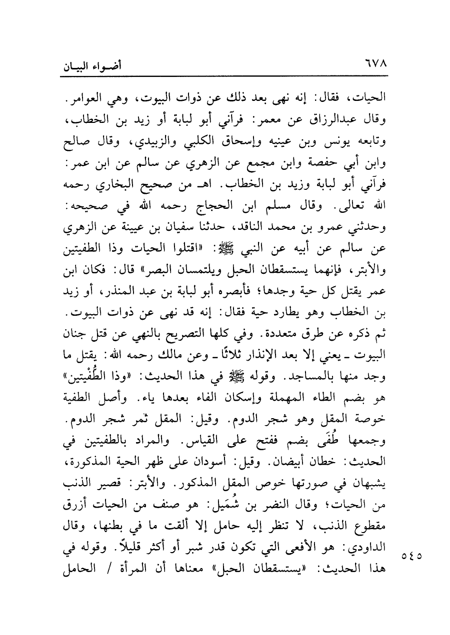 الحيات، فقال: إنه نهى بعد ذلك عن ذوات البيوت، وهي العوامر. وقال عبد الرزاق عن معمر: فرآني أبو لبابة أو زيد بن الخطاب، وتابعه يونس وبن عينيه وإسحاق الكلبي والزبيدي، وقال صالح وابن أبي حفصة وابن مجمع عن الزهري عن سالم عن ابن عمر: فرآني أبو لبابة وزيد بن الخطاب. اهـ من صحيح البخاري رحمه الله تعالى. وقال مسلم ابن الحجاج رحمه الله في صحيحه: وحدثني عمرو بن محمد الناقد، حدثنا سفيان بن عيينة عن الزهري عن سالم عن أبيه عن النبي - صلى الله عليه وسلم - : "اقتلوا الحيات وذا الطفيتين والأبتر، فإنهما يستسقطان الحبل ويلتمسان البصر" قال: فكان ابن عمر يقتل كل حية وجدها؛ فأبصره أبو لبابة بن عبد المنذر، أو زيد بن الخطاب وهو يطارد حية فقال: إنه قد نهى عن ذوات البيوت. ثم ذكره عن طرق متعددة. وفي كلها التصريح بالنهي عن قتل جنان البيوت -يعني إلا بعد الإنذار ثلاثًا- وعن مالك رحمه الله: يقتل ما وجد منها بالمساجد. وقوله - صلى الله عليه وسلم - في هذا الحديث: "وذا الطُّفْيتين" هو بضم الطاء المهملة وإسكان الفاء بعدها ياء. وأصل الطفية خوصة المقل وهو شجر الدوم. وقيل: المقل ثمر شجر الدوم. وجمعها طُفَى بضم ففتح على القياس. والمراد بالطفيتين في الحديث: خطان أبيضان. وقيل: أسودان على ظهر الحية المذكورة، يشبهان في صورتها خوص المقل المذكور. والأبتر: قصير الذنب من الحيات؛ وقال النضر بن شُمَيل: هو صنف من الحيات أزرق مقطوع الذنب، لا تنظر إليه حامل إلا ألقت ما في بطنها، وقال الداودي: هو الأفعى التي تكون قدر شبر أو أكثر قليلًا. وقوله في هذا الحديث: "يستسقطان الحبل" معناها أن المرأة الحامل