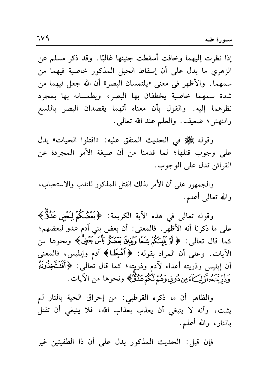 إذا نظرت إليهما وخافت أسقطت جنينها غالبًا. وقد ذكر مسلم عن الزهري ما يدل على أن إسقاط الحبل المذكور خاصية فيهما من سمهما. والأظهر في معنى "يلتمسان البصر" أن الله جعل فيهما من شدة سمهما خاصية يخطفان بها البصر، ويطمسانه بها بمجرد نظرهما إليه. والقول بأن معناه أنهما يقصدان البصر باللسع والنهش؛ ضعيف. والعلم عند الله تعالى.