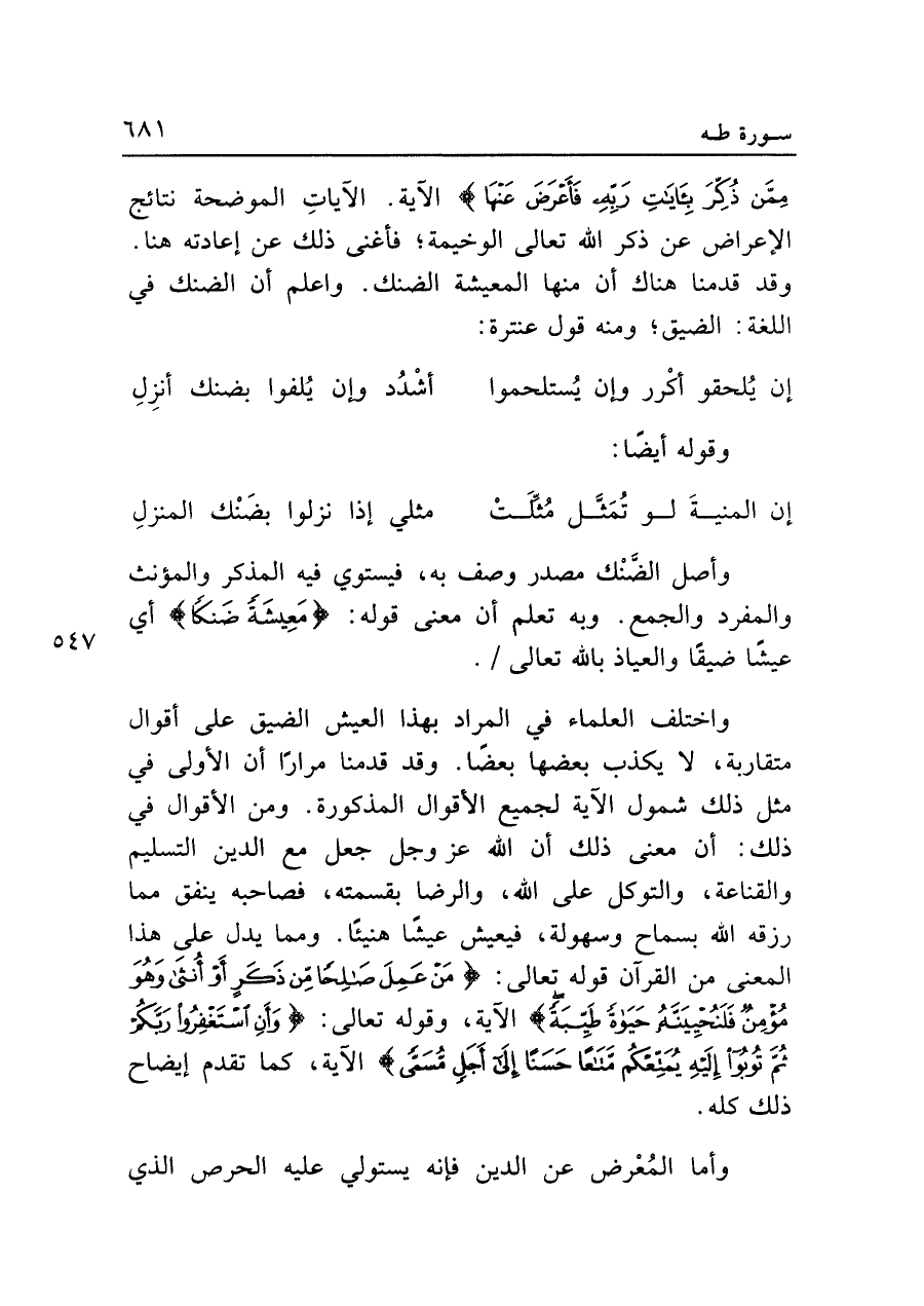 واختلف العلماء في المراد بهذا العيش الضيق على أقوال متقاربة، لا يكذب بعضها بعضًا. وقد قدمنا مرارًا أن الأولى في مثل ذلك شمول الآية لجميع الأقوال المذكورة. ومن الأقوال في ذلك: أن معنى ذلك أن الله عزَّ وجلَّ جعل مع الدين التسليم والقناعة، والتوكل على الله، والرضا بقسمته، فصاحبه ينفق مما رزقه الله بسماح وسهولة، فيعيش عيشًا هنيئًا. ومما يدل على هذا المعنى من القرآن قوله تعالى: {مَنْ عَمِلَ صَالِحًا مِنْ ذَكَرٍ أَوْ أُنْثَى وَهُوَ مُؤْمِنٌ فَلَنُحْيِيَنَّهُ حَيَاةً طَيِّبَةً} الآية، وقوله تعالى: {وَأَنِ اسْتَغْفِرُوا رَبَّكُمْ ثُمَّ تُوبُوا إِلَيهِ يُمَتِّعْكُمْ مَتَاعًا حَسَنًا إِلَى أَجَلٍ مُسَمًّى} الآية؛ كما تقدم إيضاح ذلك كله.