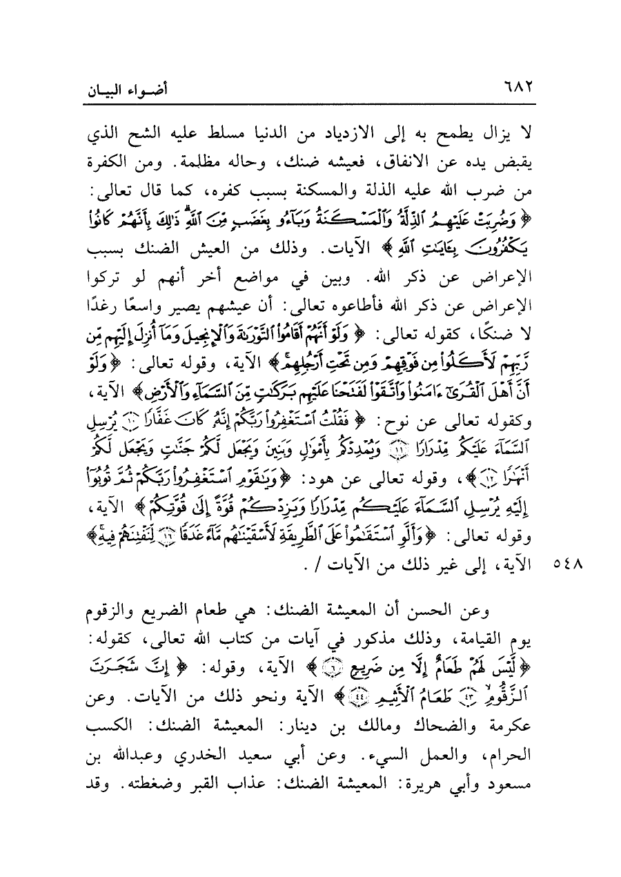 لا يزال يطمح به إلى الازدياد من الدنيا مسلط عليه الشح الذي يقبض يده عن الانفاق، فعيشه ضنك، وحاله مظلمة. ومن الكفرة من ضرب الله عليه الذلة والمسكنة بسبب كفره، كما قالى تعالى: {وَضُرِبَتْ عَلَيهِمُ الذِّلَّةُ وَالْمَسْكَنَةُ وَبَاءُوا بِغَضَبٍ مِنَ اللَّهِ ذَلِكَ بِأَنَّهُمْ كَانُوا يَكْفُرُونَ بِآيَاتِ اللَّهِ} الآيات. وذلك من العيش الضنك بسبب الإعراض عن ذكر الله. وبين في مواضع أخر أنهم لو تركوا الإعراض عن ذكر الله فأطاعوه تعالى: أن عيشهم يصير واسعًا رغدًا لا ضنكًا، كقوله تعالى: {وَلَوْ أَنَّهُمْ أَقَامُوا التَّوْرَاةَ وَالْإِنْجِيلَ وَمَا أُنْزِلَ إِلَيهِمْ مِنْ رَبِّهِمْ لَأَكَلُوا مِنْ فَوْقِهِمْ وَمِنْ تَحْتِ أَرْجُلِهِمْ} الآية، وقوله تعالى: {وَلَوْ أَنَّ أَهْلَ الْقُرَى آمَنُوا وَاتَّقَوْا لَفَتَحْنَا عَلَيهِمْ بَرَكَاتٍ مِنَ السَّمَاءِ وَالْأَرْضِ} الآية، وكقوله تعالى عن نوح: {فَقُلْتُ اسْتَغْفِرُوا رَبَّكُمْ إِنَّهُ كَانَ غَفَّارًا (١٠) يُرْسِلِ السَّمَاءَ عَلَيكُمْ مِدْرَارًا (١١) وَيُمْدِدْكُمْ بِأَمْوَالٍ وَبَنِينَ وَيَجْعَلْ لَكُمْ جَنَّاتٍ وَيَجْعَلْ لَكُمْ أَنْهَارًا (١٢)}، وقوله تعالى عن هود: {وَيَاقَوْمِ اسْتَغْفِرُوا رَبَّكُمْ ثُمَّ تُوبُوا إِلَيهِ يُرْسِلِ السَّمَاءَ عَلَيكُمْ مِدْرَارًا وَيَزِدْكُمْ قُوَّةً إِلَى قُوَّتِكُمْ} الآية، وقوله تعالى: {وَأَلَّو اسْتَقَامُوا عَلَى الطَّرِيقَةِ لَأَسْقَينَاهُمْ مَاءً غَدَقًا (١٦) لِنَفْتِنَهُمْ فِيهِ} الآية، إلى غير ذلك من الآيات.