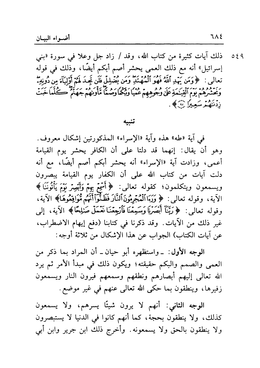 في آية "طه" هذه وآية "الإسراء" المذكورتين إشكال معروف. وهو أن يقال: إنهما قد دلتا على أن الكافر يحشر يوم القيامة أعمى، وزادت آية "الإسراء" أنه يحشر أبكم أصم أيضًا، مع أنه دلت آيات من كتاب الله على أن الكفار يوم القيامة يبصرون ويسمعون ويتكلمون؛ كقوله تعالى: {أَسْمِعْ بِهِمْ وَأَبْصِرْ يَوْمَ يَأْتُونَنَا} الآية، وقوله تعالى: {وَرَأَى الْمُجْرِمُونَ النَّارَ فَظَنُّوا أَنَّهُمْ مُوَاقِعُوهَا} الآية، وقوله تعالى: {رَبَّنَا أَبْصَرْنَا وَسَمِعْنَا فَارْجِعْنَا نَعْمَلْ صَالِحًا} الآية، إلى غير ذلك من الآيات. وقد ذكرنا في كتابنا (دفع إيهام الاضطراب، عن آيات الكتاب) الجواب عن هذا الإشكال من ثلاثة أوجه: