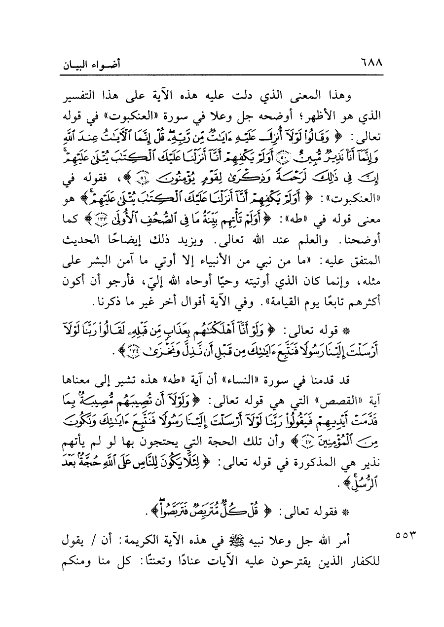 وهذا المعنى الذي دلت عليه هذه الآية على هذا التفسير الذي هو الأظهر؛ أوضحه جل وعلا في سورة "العنكبوت" في قوله تعالى: {وَقَالُوا لَوْلَا أُنْزِلَ عَلَيهِ آيَاتٌ مِنْ رَبِّهِ قُلْ إِنَّمَا الْآيَاتُ عِنْدَ اللَّهِ وَإِنَّمَا أَنَا نَذِيرٌ مُبِينٌ (٥٠) أَوَلَمْ يَكْفِهِمْ أَنَّا أَنْزَلْنَا عَلَيكَ الْكِتَابَ يُتْلَى عَلَيهِمْ إِنَّ فِي ذَلِكَ لَرَحْمَةً وَذِكْرَى لِقَوْمٍ يُؤْمِنُونَ (٥١)}، فقوله في "العنكبوت": {أَوَلَمْ يَكْفِهِمْ أَنَّا أَنْزَلْنَا عَلَيكَ الْكِتَابَ يُتْلَى عَلَيهِمْ} هو معنى قوله في "طه": {أَوَلَمْ تَأْتِهِمْ بَيِّنَةُ مَا فِي الصُّحُفِ الْأُولَى (١٣٣)} كما أوضحنا. والعلم عند الله تعالى. ويزيد ذلك إيضاحًا الحديث المتفق عليه: "ما من نبي من الأنبياء إلا أوتي ما آمن البشر على مثله، وإنما كان الذي أوتيته وحيًا أوحاه الله إليّ، فأرجو أن أكون أكثرهم تابعًا يوم القيامة". وفي الآية أقوال أخر غير ما ذكرنا.