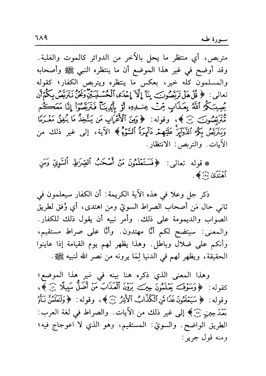 وهذا المعنى الذي ذكره هنا بينه في غير هذا الموضع؛ كقوله: {وَسَوْفَ يَعْلَمُونَ حِينَ يَرَوْنَ الْعَذَابَ مَنْ أَضَلُّ سَبِيلًا (٤٢)}، وقوله: {سَيَعْلَمُونَ غَدًا مَنِ الْكَذَّابُ الْأَشِرُ (٢٦)}، وقوله: {وَلَتَعْلَمُنَّ نَبَأَهُ بَعْدَ حِينٍ (٨٨)} إلى غير ذلك من الآيات. والصراط في لغة العرب: الطريق الواضح. والسويّ: المستقيم، وهو الذي لا اعوجاج فيه؛ ومنه قول جرير: