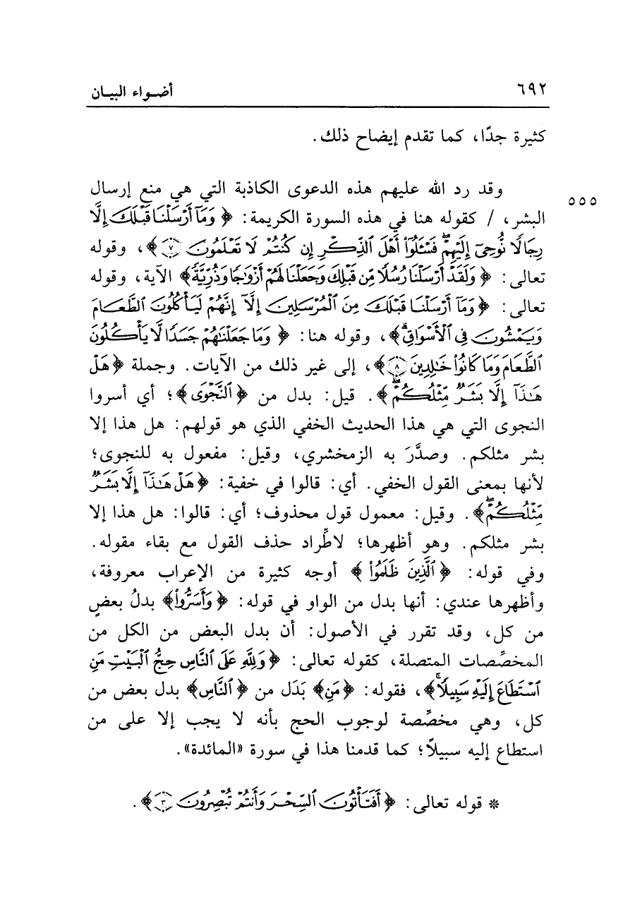 وقد رد الله عليهم هذه الدعوى الكاذبة التي هي منع إرسال البشر، كقوله هنا في هذه السورة الكريمة: {وَمَا أَرْسَلْنَا قَبْلَكَ إلا رِجَالًا نُوحِي إِلَيهِمْ فَاسْأَلُوا أَهْلَ الذِّكْرِ إِنْ كُنْتُمْ لَا تَعْلَمُونَ (٧)}، وقوله تعالى: {وَلَقَدْ أَرْسَلْنَا رُسُلًا مِنْ قَبْلِكَ وَجَعَلْنَا لَهُمْ أَزْوَاجًا وَذُرِّيَّةً} الآية، وقوله تعالى: {وَمَا أَرْسَلْنَا قَبْلَكَ مِنَ الْمُرْسَلِينَ إلا إِنَّهُمْ لَيَأْكُلُونَ الطَّعَامَ وَيَمْشُونَ فِي الْأَسْوَاقِ}، وقوله هنا: {وَمَا جَعَلْنَاهُمْ جَسَدًا لَا يَأْكُلُونَ الطَّعَامَ وَمَا كَانُوا خَالِدِينَ (٨)}، إلى غير ذلك من الآيات. وجملة {هَلْ هَذَا إلا بَشَرٌ مِثْلُكُمْ}. قيل: بدل من {النَّجْوَى}؛ أي أسروا النجوى التي هي هذا الحديث الخفي الذي هو قولهم: هل هذا إلا بشر مثلكم. وصدَّرَ به الزمخشري، وقيل: مفعول به للنجوى؛ لأنها بمعنى القول الخفي. أي: قالوا في خفية: {هَلْ هَذَا إلا بَشَرٌ مِثْلُكُمْ}. وقيل: معمول قول محذوف؛ أي: قالوا: هل هذا إلا بشر مثلكم. وهو أظهرها؛ لاطِّراد حذف القول مع بقاء مقوله. وفي قوله: {الَّذِينَ ظَلَمُوا} أوجه كثيرة من الإعراب معروفة، وأظهرها عندي: أنها بدل من الواو في قوله: {وَأَسَرُّوا} بدلُ بعضٍ من كل، وقد تقرر في الأصول: أن بدل البعض من الكل من المخصِّصات المتصلة، كقوله تعالى: {وَلِلَّهِ عَلَى النَّاسِ حِجُّ الْبَيتِ مَنِ اسْتَطَاعَ إِلَيهِ سَبِيلًا}، فقوله: {مَنِ} بَدَل من {النَّاسِ} بدل بعض من كل، وهي مخصِّصة لوجوب الحج بأنه لا يجب إلا على من استطاع إليه سبيلًا؛ كما قدمنا هذا في سورة "المائدة".