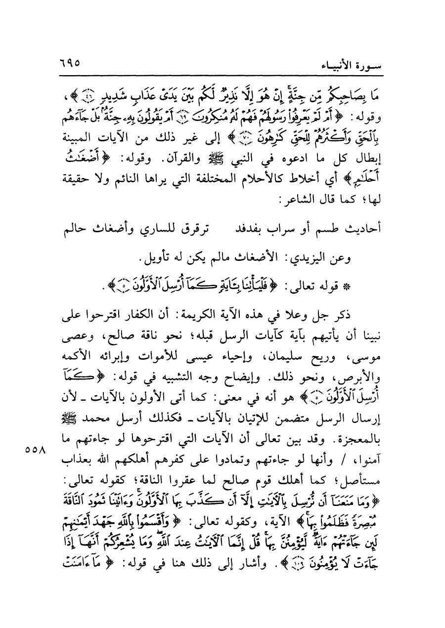 مَا بِصَاحِبِكُمْ مِنْ جِنَّةٍ إِنْ هُوَ إلا نَذِيرٌ لَكُمْ بَينَ يَدَي عَذَابٍ شَدِيدٍ (٤٦)}، وقوله: {أَمْ لَمْ يَعْرِفُوا رَسُولَهُمْ فَهُمْ لَهُ مُنْكِرُونَ (٦٩) أَمْ يَقُولُونَ بِهِ جِنَّةٌ بَلْ جَاءَهُمْ بِالْحَقِّ وَأَكْثَرُهُمْ لِلْحَقِّ كَارِهُونَ (٧٠)} إلى غير ذلك من الآيات المبينة إبطال كل ما ادعوه في النبي - صلى الله عليه وسلم - والقرآن. وقوله: {أَضْغَاثُ أَحْلَامٍ} أي أخلاط كالأحلام المختلفة التي يراها النائم ولا حقيقة لها؛ كما قال الشاعر: