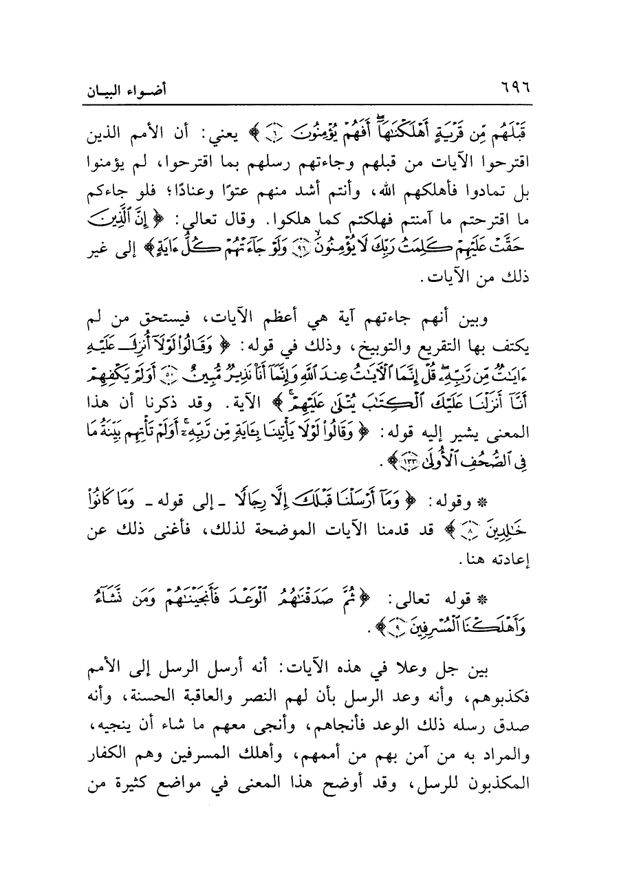قَبْلَهُمْ مِنْ قَرْيَةٍ أَهْلَكْنَاهَا أَفَهُمْ يُؤْمِنُونَ (٦)} يعني: أن الأمم الذين اقترحوا الآيات من قبلهم وجاءتهم رسلهم بما اقترحوا، لم يؤمنوا بل تمادوا فأهلكهم الله، وأنتم أشد منهم عتوًا وعنادًا؛ فلو جاءكم ما اقترحتم ما آمنتم فهلكتم كما هلكوا. وقال تعالى: {إِنَّ الَّذِينَ حَقَّتْ عَلَيهِمْ كَلِمَتُ رَبِّكَ لَا يُؤْمِنُونَ (٩٦) وَلَوْ جَاءَتْهُمْ كُلُّ آيَةٍ} إلى غير ذلك من الآيات.