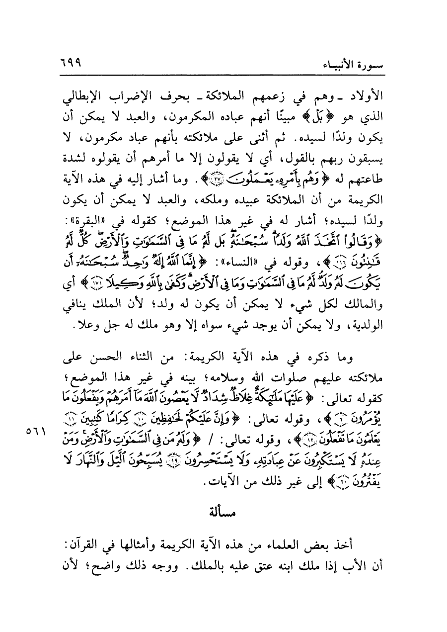 الأولاد -وهم في زعمهم الملائكة- بحرف الإضراب الإبطالي الذي هو {بَلْ} مبينًا أنهم عباده المكرمون، والعبد لا يمكن أن يكون ولدًا لسيده. ثم أثنى على ملائكته بأنهم عباد مكرمون، لا يسبقون ربهم بالقول، أي لا يقولون إلا ما أمرهم أن يقولوه لشدة طاعتهم له {وَهُمْ بِأَمْرِهِ يَعْمَلُونَ (٢٧)}. وما أشار إليه في هذه الآية الكريمة من أن الملائكة عبيده وملكه، والعبد لا يمكن أن يكون ولدًا لسيده؛ أشار له في غير هذا الموضع؛ كقوله في "البقرة": {وَقَالُوا اتَّخَذَ اللَّهُ وَلَدًا سُبْحَانَهُ بَلْ لَهُ مَا فِي السَّمَاوَاتِ وَالْأَرْضِ كُلٌّ لَهُ قَانِتُونَ (١١٦)}، وقوله في "النساء": {إِنَّمَا اللَّهُ إِلَهٌ وَاحِدٌ سُبْحَانَهُ أَنْ يَكُونَ لَهُ وَلَدٌ لَهُ مَا فِي السَّمَاوَاتِ وَمَا فِي الْأَرْضِ وَكَفَى بِاللَّهِ وَكِيلًا (١٧١)} أي والمالك لكل شيء لا يمكن أن يكون له ولد؛ لأن الملك ينافي الولدية، ولا يمكن أن يوجد شيء سواه إلا وهو ملك له جل وعلا.