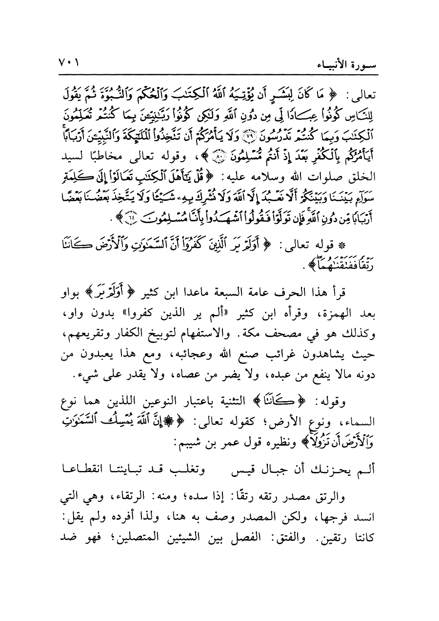 • قوله تعالى: {أَوَلَمْ يَرَ الَّذِينَ كَفَرُوا أَنَّ السَّمَاوَاتِ وَالْأَرْضَ كَانَتَا رَتْقًا فَفَتَقْنَاهُمَا}.