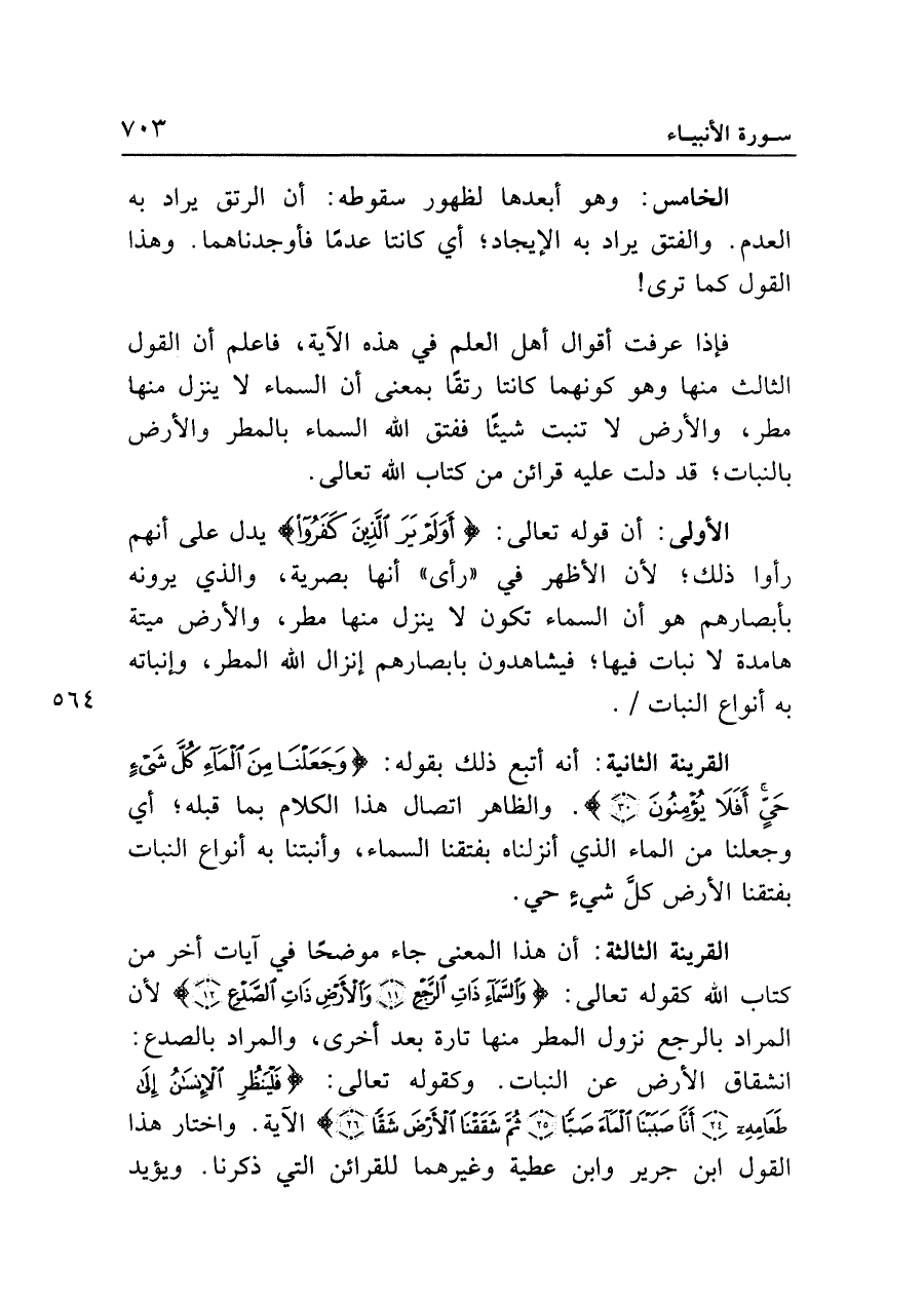 القرينة الثانية: أنه أتبع ذلك بقوله: {وَجَعَلْنَا مِنَ الْمَاءِ كُلَّ شَيءٍ حَيٍّ أَفَلَا يُؤْمِنُونَ (٣٠)}. والظاهر اتصال هذا الكلام بما قبله؛ أي وجعلنا من الماء الذي أنزلناه بفتقنا السماء، وأنبتنا به أنواع النبات بفتقنا الأرض كلَّ شيءٍ حي.