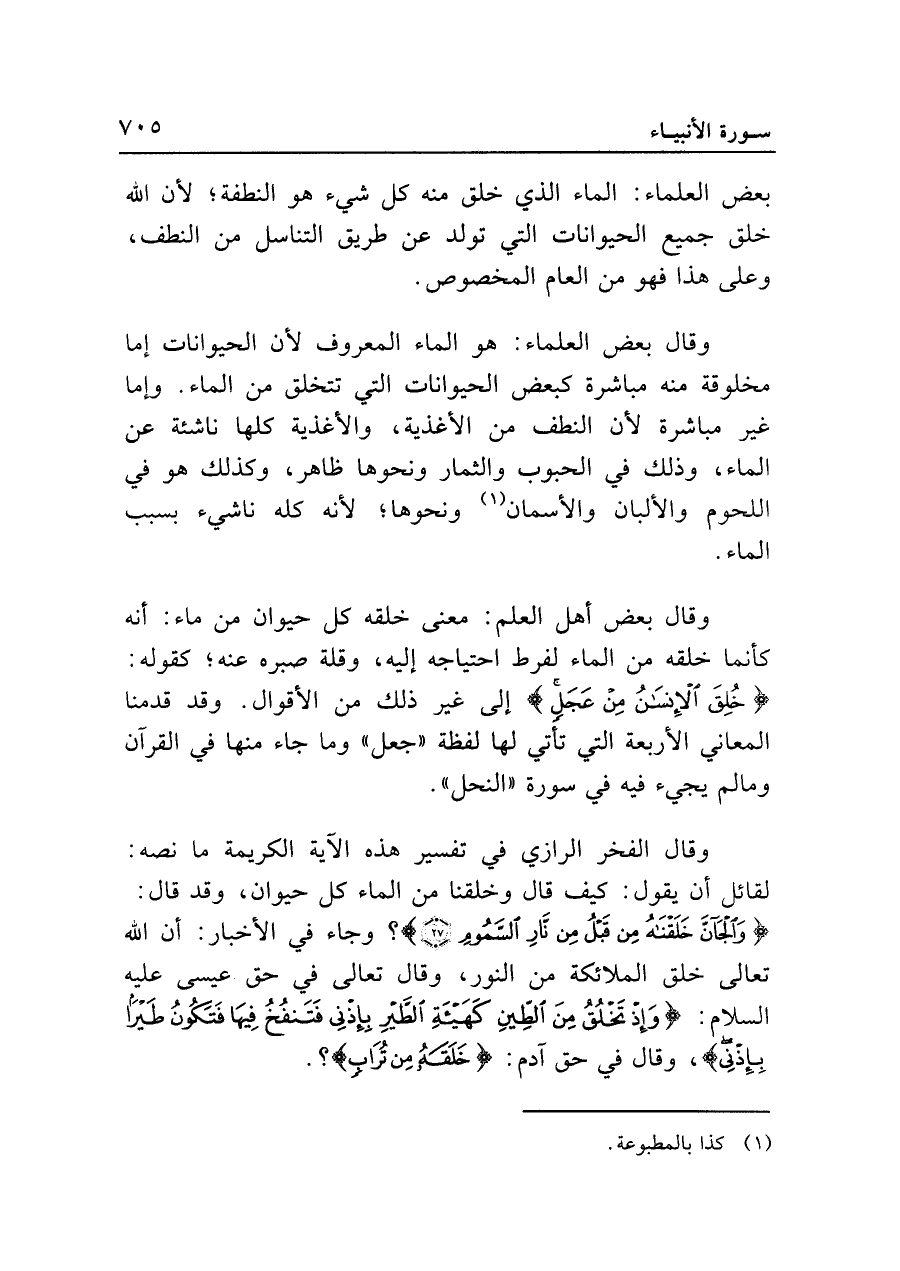 وقال الفخر الرازي في تفسير هذه الآية الكريمة ما نصه: لقائل أن يقول: كيف قال وخلقنا من الماء كل حيوان، وقد قال: {وَالْجَانَّ خَلَقْنَاهُ مِنْ قَبْلُ مِنْ نَارِ السَّمُومِ (٢٧) }؟ وجاء في الأخبار: أن الله تعالى خلق الملائكة من النور، وقال تعالى في حق عيسى عليه السلام: {وَإِذْ تَخْلُقُ مِنَ الطِّينِ كَهَيئَةِ الطَّيرِ بِإِذْنِي فَتَنْفُخُ فِيهَا فَتَكُونُ طَيرًا بِإِذْنِي}، وقال في حق آدم: {خَلَقَهُ مِنْ تُرَابٍ}؟.