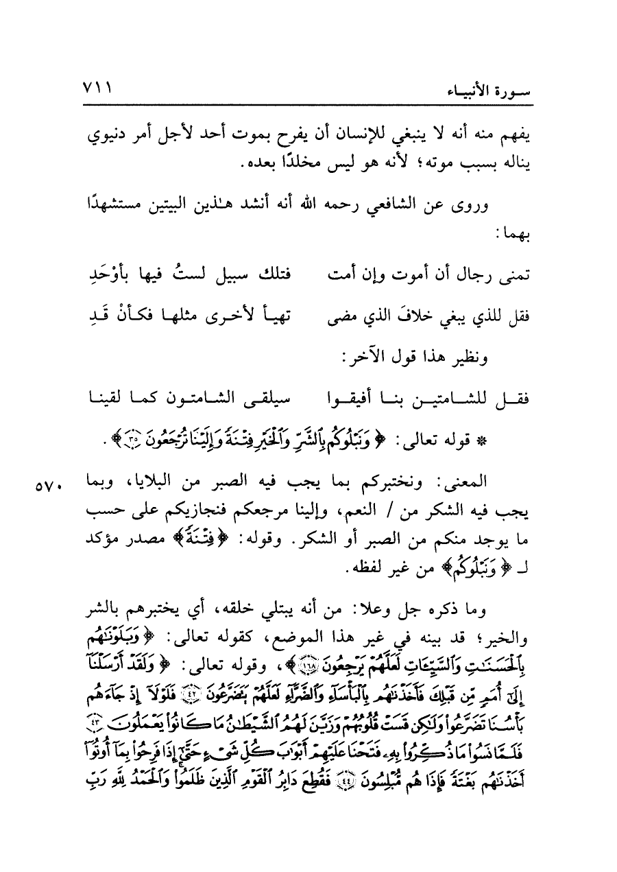 • قوله تعالى: {وَنَبْلُوكُمْ بِالشَّرِّ وَالْخَيرِ فِتْنَةً وَإِلَينَا تُرْجَعُونَ (٣٥)}.