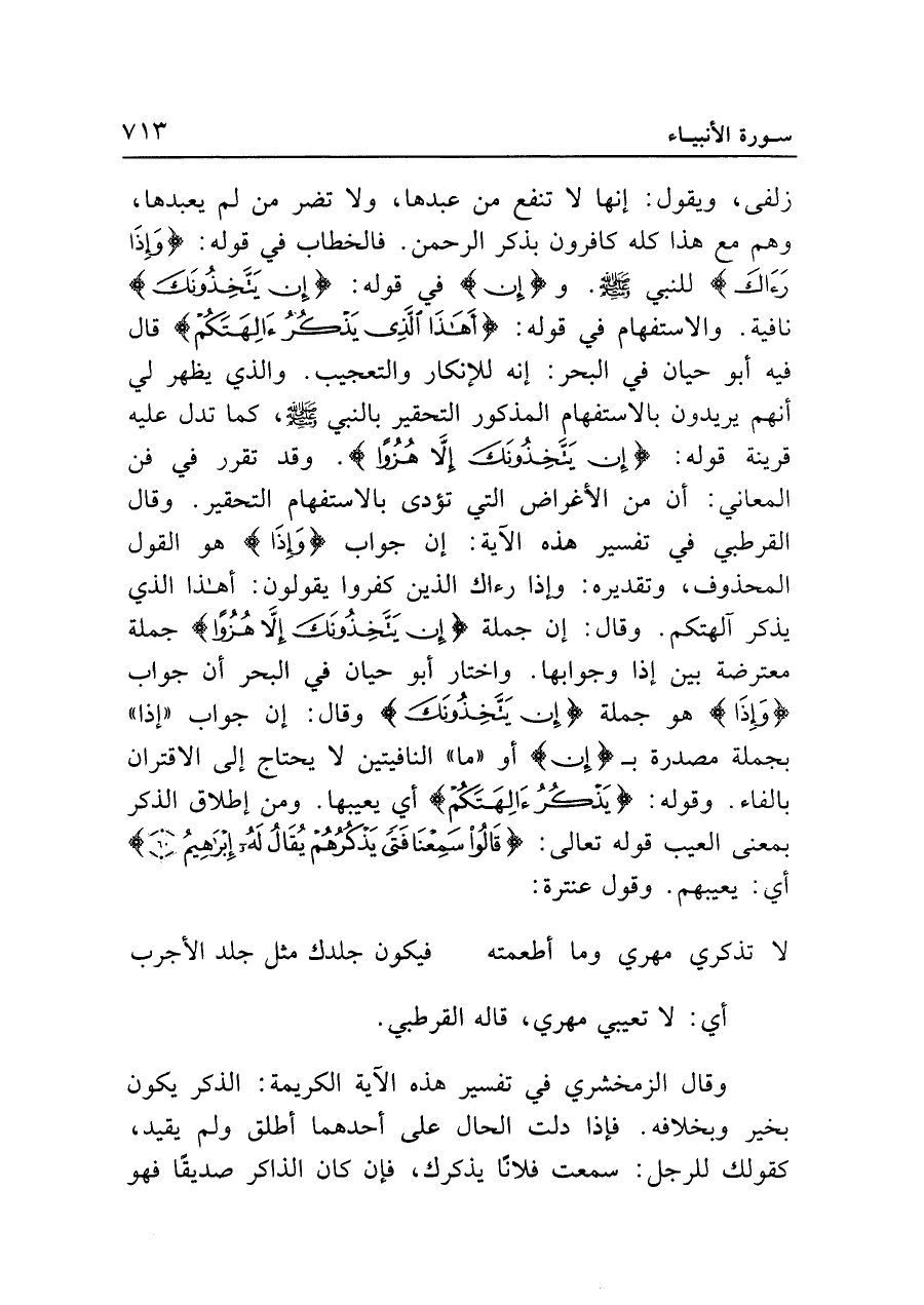 زلفى، ويقول: إنها لا تنفع من عبدها، ولا تضر من لم يعبدها، وهم مع هذا كله كافرون بذكر الرحمن. فالخطاب في قوله: {وَإِذَا رَآكَ} للنبي - صلى الله عليه وسلم -. و {إِنْ} في قوله: {إِنْ يَتَّخِذُونَكَ} نافية. والاستفهام في قوله: {أَهَذَا الَّذِي يَذْكُرُ آلِهَتَكُمْ} قال فيه أبو حيان في البحر: إنه للإنكار والتعجيب. والذي يظهر لي أنهم يريدون بالاستفهام المذكور التحقير بالنبي - صلى الله عليه وسلم -، كما تدل عليه قرينة قوله: {إِنْ يَتَّخِذُونَكَ إلا هُزُوًا}. وقد تقرر في فن المعاني: أن من الأغراض التي تؤدى بالاستفهام التحقير. وقال القرطبي في تفسير هذه الآية: إن جواب {وَإِذَا} هو القول المحذوف، وتقديره: وإذا رءاك الذين كفروا يقولون: أهذا الذي يذكر آلهتكم. وقال: إن جملة {إِنْ يَتَّخِذُونَكَ إلا هُزُوًا} جملة معترضة بين إذا وجوابها. واختار أبو حيان في البحر أن جواب {وَإِذَا} هو جملة {إِنْ يَتَّخِذُونَكَ} وقال: إن جواب "إذا" بجملة مصدرة بـ {إِنْ} أو "ما" النافيتين لا يحتاج إلى الاقتران بالفاء. وقوله: {يَذْكُرُ آلِهَتَكُمْ} أي يعيبها. ومن إطلاق الذكر بمعنى العيب قوله تعالى: {قَالُوا سَمِعْنَا فَتًى يَذْكُرُهُمْ يُقَالُ لَهُ إِبْرَاهِيمُ (٦٠)} أي: يعيبهم. وقول عنترة: