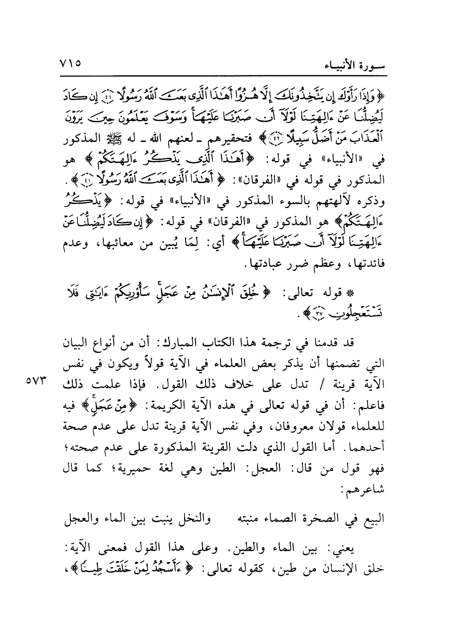 {وَإِذَا رَأَوْكَ إِنْ يَتَّخِذُونَكَ إلا هُزُوًا أَهَذَا الَّذِي بَعَثَ اللَّهُ رَسُولًا (٤١) إِنْ كَادَ لَيُضِلُّنَا عَنْ آلِهَتِنَا لَوْلَا أَنْ صَبَرْنَا عَلَيهَا وَسَوْفَ يَعْلَمُونَ حِينَ يَرَوْنَ الْعَذَابَ مَنْ أَضَلُّ سَبِيلًا (٤٢)} فتحقيرهم -لعنهم الله- له - صلى الله عليه وسلم - المذكور في "الأنبياء" في قوله: {أَهَذَا الَّذِي يَذْكُرُ آلِهَتَكُمْ} هو المذكور في قوله في "الفرقان": {أَهَذَا الَّذِي بَعَثَ اللَّهُ رَسُولًا (٤١)}. وذكره لآلهتهم بالسوء المذكور في "الأنبياء" في قوله: {يَذْكُرُ آلِهَتَكُمْ} هو المذكور في "الفرقان" في قوله: {إِنْ كَادَ لَيُضِلُّنَا عَنْ آلِهَتِنَا لَوْلَا أَنْ صَبَرْنَا عَلَيهَا} أي: لِمَا يُبين من معائبها، وعدم فائدتها، وعظم ضرر عبادتها.