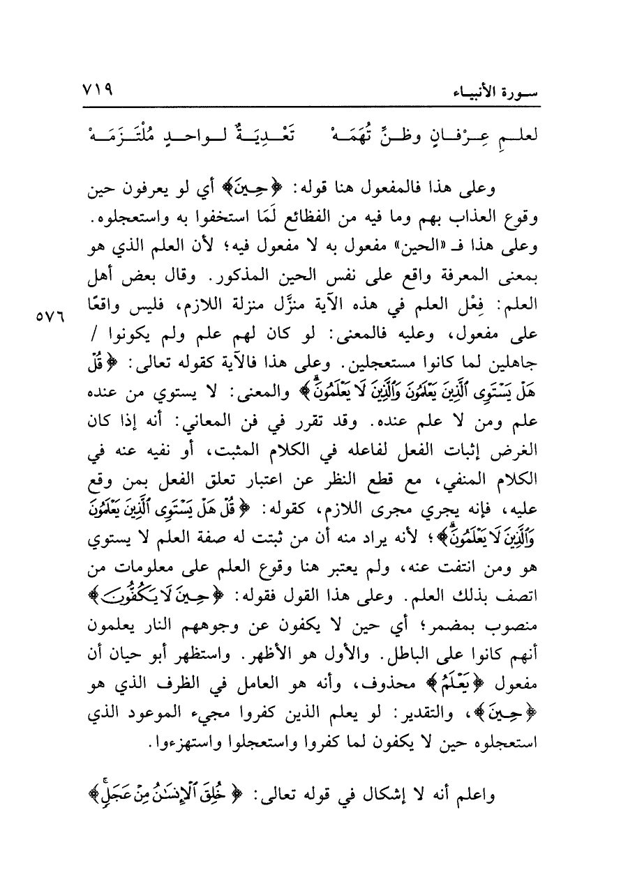 وعلى هذا فالمفعول هنا قوله: {حِينَ} أي لو يعرفون حين وقوع العذاب بهم وما فيه من الفظائع لَمَا استخفوا به واستعجلوه. وعلى هذا فـ"الحين" مفعول به لا مفعول فيه؛ لأن العلم الذي هو بمعنى المعرفة واقع على نفس الحين المذكور. وقال بعض أهل العلم: فِعْل العلم في هذه الآية منزَّل منزلة اللازم، فليس واقعًا على مفعول، وعليه فالمعنى: لو كان لهم علم ولم يكونوا جاهلين لما كانوا مستعجلين. وعلى هذا فالآية كقوله تعالى: {قُلْ هَلْ يَسْتَوي الَّذِينَ يَعْلَمُونَ وَالَّذِينَ لَا يَعْلَمُونَ} والمعنى: لا يستوي من عنده علم ومن لا علم عنده. وقد تقرر في فن المعاني: أنه إذا كان الغرض إثبات الفعل لفاعله في الكلام المثبت، أو نفيه عنه في الكلام المنفي، مع قطع النظر عن اعتبار تعلق الفعل بمن وقع عليه، فإنه يجري مجرى اللازم، كقوله: {قُلْ هَلْ يَسْتَوي الَّذِينَ يَعْلَمُونَ وَالَّذِينَ لَا يَعْلَمُونَ}؛ لأنه يراد منه أن من ثبتت له صفة العلم لا يستوي هو ومن انتفت عنه، ولم يعتبر هنا وقوع العلم على معلومات من اتصف بذلك العلم. وعلى هذا القول فقوله: {حِينَ لَا يَكُفُّونَ} منصوب بمضمر؛ أي حين لا يكفون عن وجوههم النار يعلمون أنهم كانوا على الباطل. والأول هو الأظهر. واستظهر أبو حيان أن مفعول {يَعْلَمُ} محذوف، وأنه هو العامل في الظرف الذي هو {حِينَ}، والتقدير: لو يعلم الذين كفروا مجيء الموعود الذي استعجلوه حين لا يكفون لما كفروا واستعجلوا واستهزءوا.