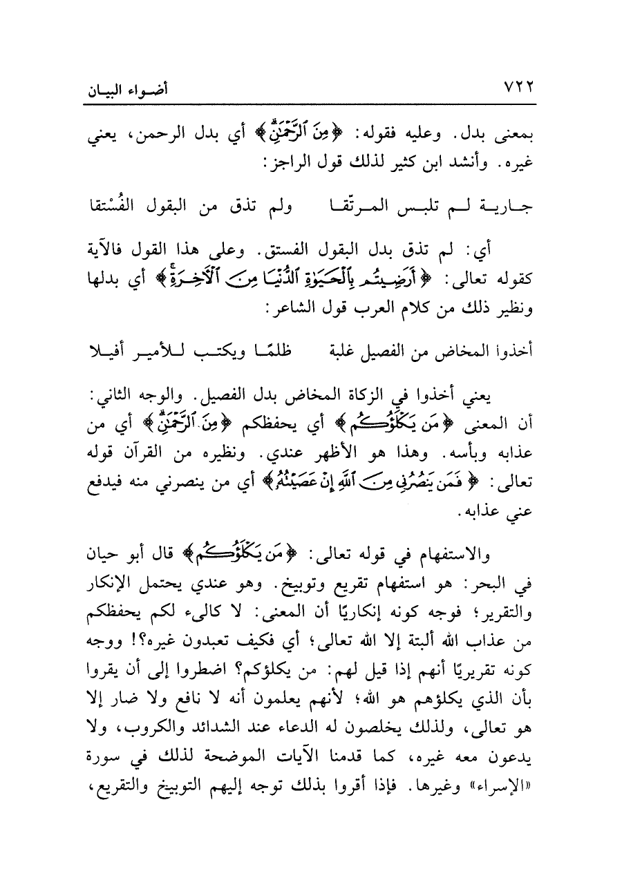 يعني أخذوا في الزكاة المخاض بدل الفصيل. والوجه الثاني: أن المعنى {مَنْ يَكْلَؤُكُمْ} أي يحفظكم {مِنَ الرَّحْمَنِ} أي من عذابه وبأسه. وهذا هو الأظهر عندي. ونظيره من القرآن قوله تعالى: {فَمَنْ يَنْصُرُنِي مِنَ اللَّهِ إِنْ عَصَيتُهُ} أي من ينصرني منه فيدفع عني عذابه.