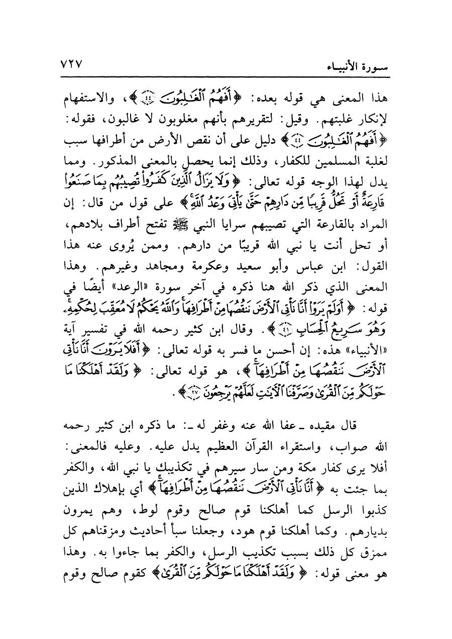 هذا المعنى هي قوله بعده: {أَفَهُمُ الْغَالِبُونَ (٤٤}، والاستفهام لإنكار غلبتهم. وقيل: لتقريرهم بأنهم مغلوبون لا غالبون فقوله: {أَفَهُمُ الْغَالِبُونَ (٤٤)} دليل على أن نقص الأرض من أطرافها سبب لغلبة المسلمين للكفار، وذلك إنما يحصل بالمعنى المذكور. ومما يدل لهذا الوجه قوله تعالى: {وَلَا يَزَالُ الَّذِينَ كَفَرُوا تُصِيبُهُمْ بِمَا صَنَعُوا قَارِعَةٌ أَوْ تَحُلُّ قَرِيبًا مِنْ دَارِهِمْ حَتَّى يَأْتِيَ وَعْدُ اللَّهِ} على قول من قال: إن المراد بالقارعة التي تصيبهم سرايا النبي - صلى الله عليه وسلم - تفتح أطراف بلادهم , أو تحل أنت يا نبي الله قريبًا من دارهم. وممن يُروى عنه هذا القول: ابن عباس وأبو سعيد وعكرمة ومجاهد وغيرهم. وهذا المعنى الذي ذكر الله هنا ذكره في آخر سورة "الرعد" أيضًا في قوله: {أَوَلَمْ يَرَوْا أَنَّا نَأْتِي الْأَرْضَ نَنْقُصُهَا مِنْ أَطْرَافِهَا وَاللَّهُ يَحْكُمُ لَا مُعَقِّبَ لِحُكْمِهِ وَهُوَ سَرِيعُ الْحِسَابِ(٤١)}. وقال ابن كثير رحمه الله في تفسير آية "الأنبياء" هذه: إن أحسن ما فسر به قوله تعالى: {أَفَلَا يَرَوْنَ أَنَّا نَأْتِي الْأَرْضَ نَنْقُصُهَا مِنْ أَطْرَافِهَا}، هو قوله تعالى: {وَلَقَدْ أَهْلَكْنَا مَا حَوْلَكُمْ مِنَ الْقُرَى وَصَرَّفْنَا الْآيَاتِ لَعَلَّهُمْ يَرْجِعُونَ (٢٧)}.