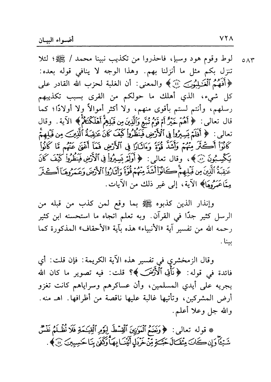 وإنذار الذين كذبوه - صلى الله عليه وسلم - بما وقع لمن كذب من قبله من الرسل كثير جدًا في القرآن. وبه تعلم اتجاه ما استحسنه ابن كثير رحمه الله من تفسير آية "الأنبياء" هذه بآية "الأحقاف" المذكورة كما بينا.