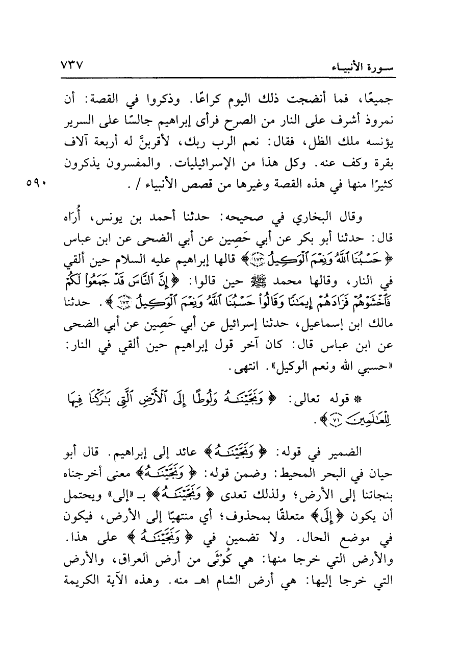 • قوله تعالى: {وَنَجَّينَاهُ وَلُوطًا إِلَى الْأَرْضِ الَّتِي بَارَكْنَا فِيهَا لِلْعَالمِينَ (٧١)}.